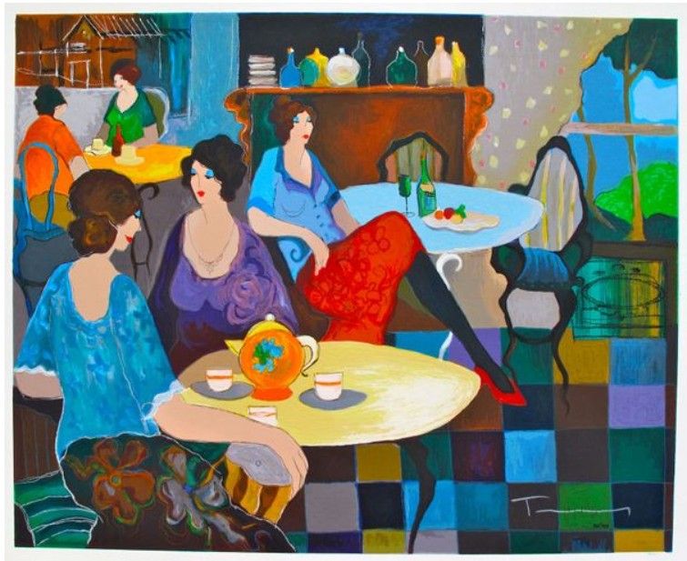 This is a limited edition hand signed serigraph by Itzchak Tarkay titled "AFTERNOON TEA". Medium: Serigraph on White Coventry Paper Hand Signed and Numbered by the artist. Edition number: 152/199. Paper size: 26" x 31.5. Image size: 23" x 28.5". Comes with a certificate of authenticity. Comes unframed.
