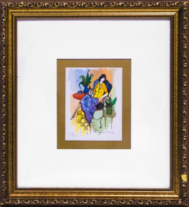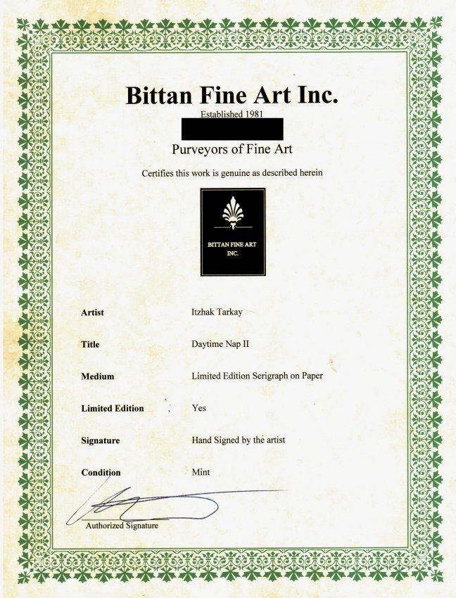 Itzchak Tarkay "Daytime Nap II" Limited Edition Serigraph on Paper. Image Size: 4" x 5" Frame Size: 13.25" x 14.5" , comes with COA and framed. The frame has some scratches and chips. W702