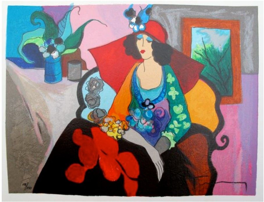 This is a limited edition hand signed serigraph by Itzchak Tarkay titled "RED HAT". Medium: Serigraph on White Coventry Paper Hand Signed and Numbered by the artist. This subject is numbered from an edition size of 750. Paper size: 11" x 13.5. Image size: 9" x 11.5". Comes with a certificate of authenticity. Comes unframed.