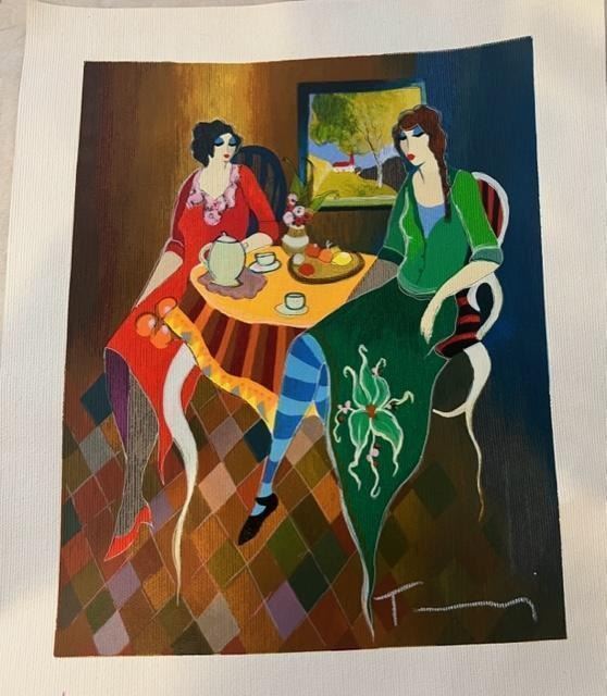 Itzchak Tarkay Israeli Artist b. 1935-2012. Tarkay drew upon the entire realm of art history in a body of work that is not only aesthetically agreeable and compositionally seductive but a cultural phenomenon responsible for countless love letters, innumerable nights of passion and incalculable furtive glances - the very substance of visual poetry. Today's roots as a painter take hold in the decisive years of modern art. The bright colors and flat patterns build on the paths forged by Matisse, Mouly, and the Fauves. Like Picasso and Tobias, the sculptural grows stronger than the pictorial. Tarkay constructed a perspective and then took it away. The paintings go through an abstract transformation, the perspective dissolves into colors and shapes, her face remains, and the world reconstructs around her. There is an ancient mystery in the work of Tarkay that must be discovered for oneself. Tarkay dove deep into history and brought up pearls for our times. The quality of his line was organic, the quality of his woman, his art, was magic.
