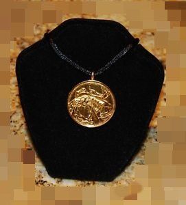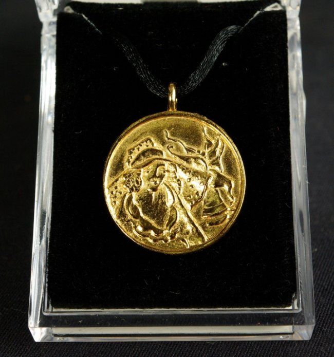 Itzchak Tarkay, enitled: Women in Hat. This double sided gold pendant necklace from the Tarkay collection bears an original Tarkay subject on the front of it. Signed by Tarkay in the casting on verso. The pendant is gold vermeil over bronze. Measures approx 1-1/8" Diameter,comes in a black silk cord that measures approx 24". Beautifully packed in a jewelry gift box. Condition: Mint