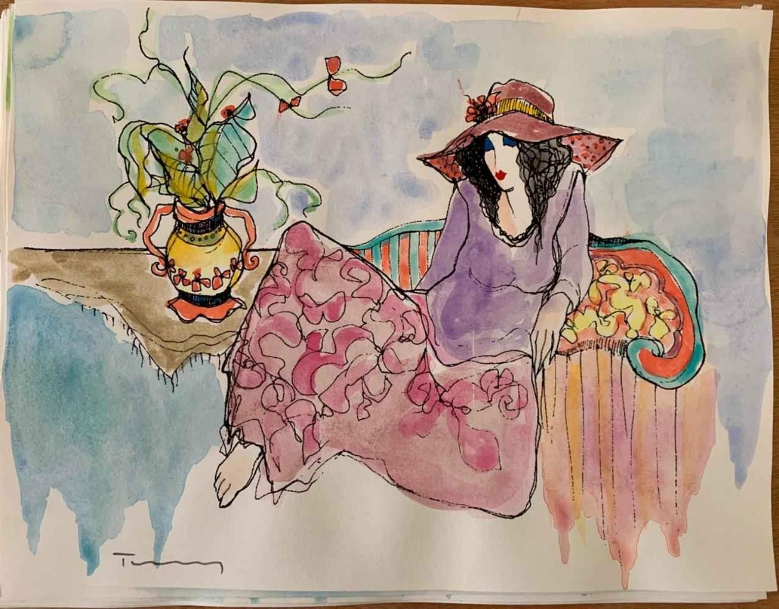 Itzchak Tarkay "Watercolor (Untitled Ref. #8)" Original Mixed Media Watercolor, Hand Signed Dimensions: 11 x 8.5 inches