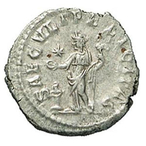 Iulia Maesa, sorella di Iulia Domna (deceduta nel 225 d.C.). Denario. D/ Busto drappeggiato a destra. R/ SAECVLI FELICITAS. La Felicitas, stante tre quarti a sinistra, tiene caduceo e sacrifica con patera su altare. Nel campo a sinistra, stella. RIC 272. gr. 3.54 AG. SPL. Fondi lucenti.