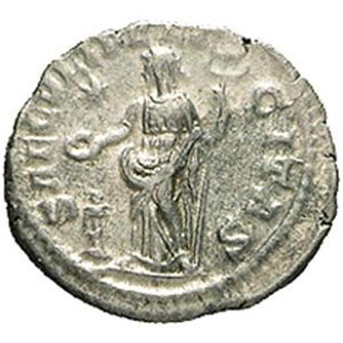 Iulia Maesa, sorella di Iulia Domna (deceduta nel 225 d.C.). Denario. D/ Busto drappeggiato a destra. R/ SAECVLI FELICITAS. La Felicitas, stante tre quarti a sinistra, tiene caduceo e sacrifica con patera su altare. Nel campo a sinistra, stella. RIC 272. gr. 3.14 AG. BB.