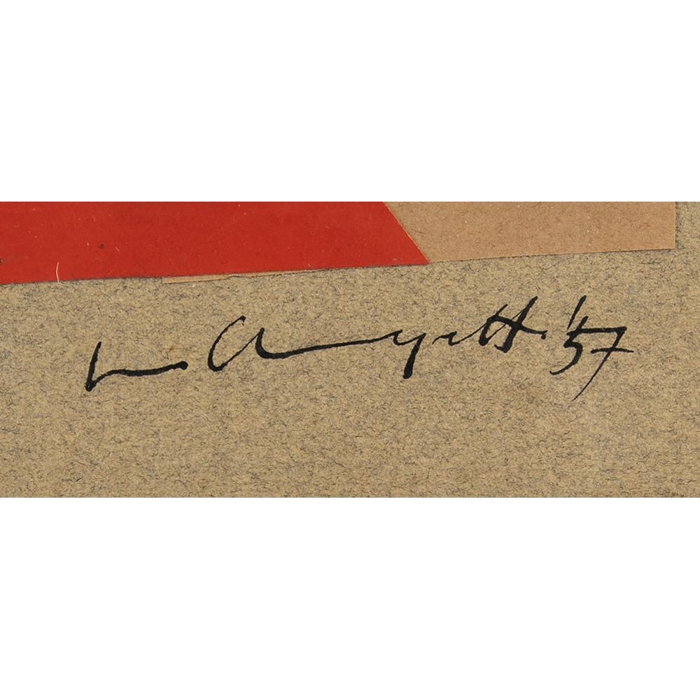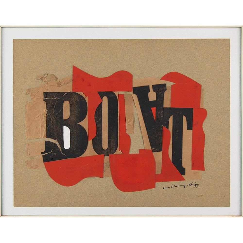 Graphic designer (1932–2017) who created some of the most recognizable corporate logos of the late 20th century, including those for the cable channel Showtime, the publisher HarperCollins, and the Smithsonian Institution. Highly desirable original mixed media collage artwork by Ivan Chermayeff, cut paper and block-letter print on a 12.5 x 9.75 cardstock sheet, signed in the lower right in fountain pen, "Ivan Chermayeff, '57." The unique artwork reads "BOAT," with the "A" upside down, on hand-cut and torn kraft paper, embellished with red paper accents. Handsomely mounted and framed to an overall size of 14 x 11. In fine condition.