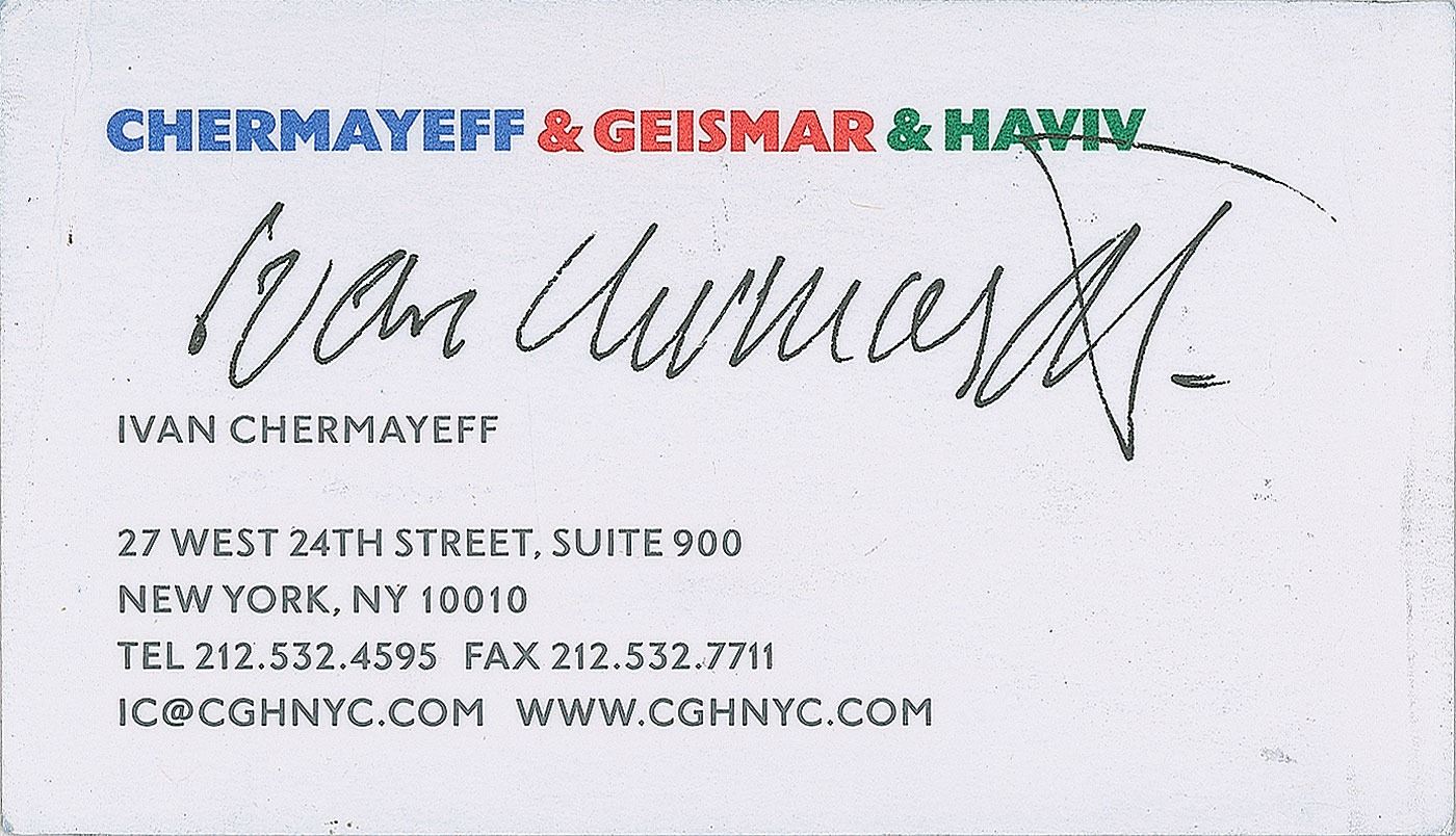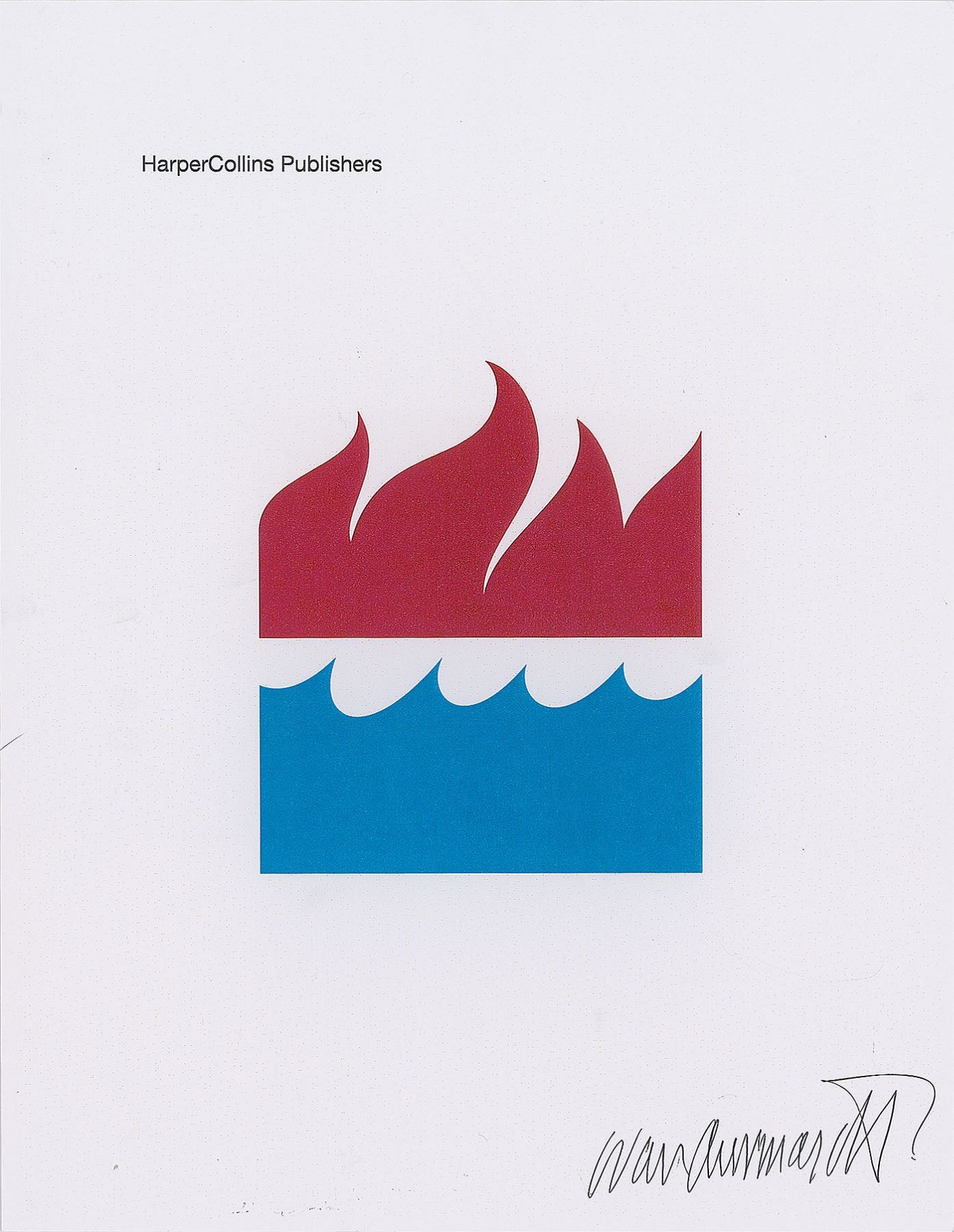 Two items: a semi-glossy 8.5 x 11 laserprint photo of the fire-and-water logo for HarperCollins Publishers, signed below in black ink; and a personal Chermayeff & Geismar & Haviv business card belonging to Chermayeff, 3.5 x 2, signed in black ink. In overall very fine condition.