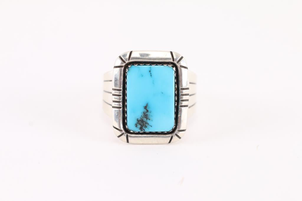 Rectangle Shaped Turquoise Stone Set In Sterling Silver Maker Marked. 9 3/4 Size
