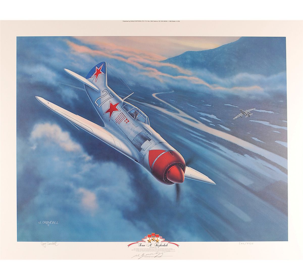 World War II fighter ace (1920-1991) credited with 62 individual air victories. Color 29 x 22.75 print of Kozhedub’s Lavochkin La-7, numbered #346/950, signed in pencil. Also signed in pencil by the artist, Jerry Crandall. In fine condition.