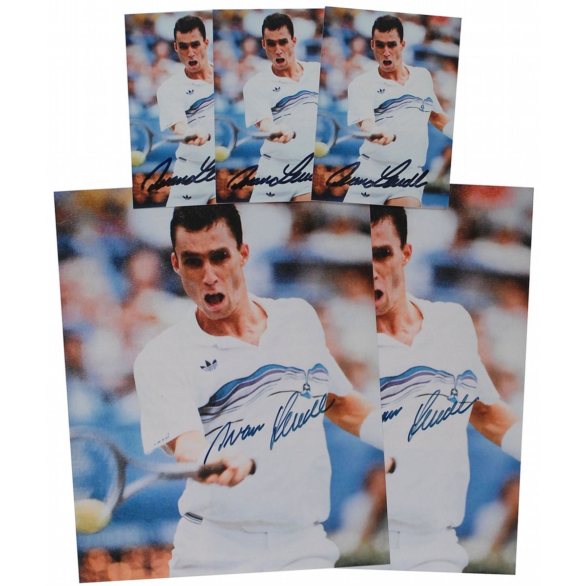Five color photos of Lendl in action on the court, two glossy 8 x 10 and three satin-finish 3.5 x 5, each signed in blue or black felt tip. In fine condition.