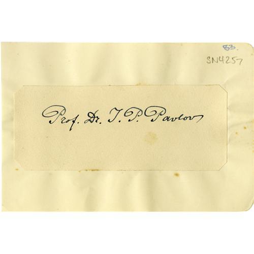 <B>Ivan Pavlov Autograph</B></I> signed "<I>Prof. Dr. I.P. Pavlov</B></I>" on 5" x 2" card affixed to 6" x 4" album page. Nobel Laureate Ivan Petrovich Pavlov (1849-1936) is best known for his conditioning experiments with salivating dogs. A scarce signature. Light stains do not detract. Fine condition. <BR><BR><B>Important