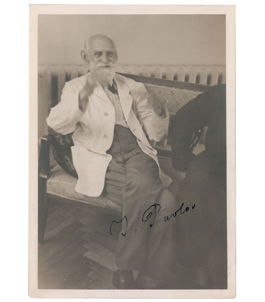 Russian physiologist (1849–1936) best known for his investigation of conditioned reflex through the use of experiments involving salivating dogs. He was awarded the Nobel Prize in Medicine in 1904. Highly sought-after matte-finish 4.75 x 6.5 candid photo of Pavlov in a lab coat, signed in fountain pen, “I. Pavlov.” Affixed to a same-size mount. In fine condition. An exceedingly scarce format. Previously sold by Christie’s, 2007.