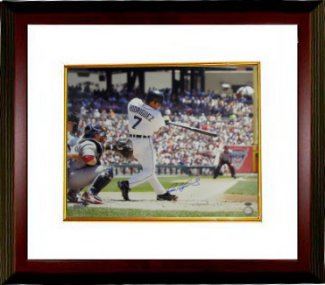Ivan Rodriguez, nicknamed "Pudge," played for the Texas Rangers, Florida Marlins, Detroit Tigers, New York Yankees, Houston Astros and Washington Nationals. Rodriguez was awarded the AL MVP award in 1999. He is also regarded as one of the best defensive catchers of all time. Rodriguez won the World Series with the Marlins in 2003, and also played in the 2006 World Series while with the Tigers. On June 17, 2009, Rodriguez set a MLB record by catching his 2,227th game, passing Carlton Fisk. During his career, he had the best caught stealing percentage of any major league catcher, at 45.68%. Ivan Rodriguez has hand signed this Detroit Tigers 16x20 Photo Vertical Batting. Leaf Authentic Hologram and Certificate of Authenticity from Athlon Sports. Custom White Mat and Premium Mahogany Frame as shown.