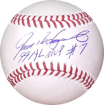 Ivan Rodriguez, nicknamed "Pudge," played for the Texas Rangers, Florida Marlins, Detroit Tigers, New York Yankees, Houston Astros and Washington Nationals. Rodriguez was awarded the AL MVP award in 1999. He is also regarded as one of the best defensive catchers of all time. Rodriguez won the World Series with the Marlins in 2003, and also played in the 2006 World Series while with the Tigers. On June 17, 2009, Rodriguez set a MLB record by catching his 2,227th game, passing Carlton Fisk. During his career, he had the best caught stealing percentage of any major league catcher, at 45.68%. Ivan Rodriguez has hand signed this Official Major League Baseball with 99 AL MVP inscription. JSA Hologram and Certificate of Authenticity.