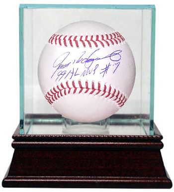 Ivan Rodriguez, nicknamed "Pudge," played for the Texas Rangers, Florida Marlins, Detroit Tigers, New York Yankees, Houston Astros and Washington Nationals. Rodriguez was awarded the AL MVP award in 1999. He is also regarded as one of the best defensive catchers of all time. Rodriguez won the World Series with the Marlins in 2003, and also played in the 2006 World Series while with the Tigers. On June 17, 2009, Rodriguez set a MLB record by catching his 2,227th game, passing Carlton Fisk. During his career, he had the best caught stealing percentage of any major league catcher, at 45.68%. Ivan Rodriguez has hand signed this Official Major League Baseball with 99 AL MVP inscription. JSA Hologram and Certificate of Authenticity. Glass Display Case shown IS included.