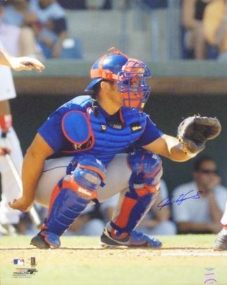 Ivan Rodriguez, nicknamed "Pudge," played for the Texas Rangers, Florida Marlins, Detroit Tigers, New York Yankees, Houston Astros and Washington Nationals. Rodriguez was awarded the AL MVP award in 1999. He is also regarded as one of the best defensive catchers of all time. Rodriguez won the World Series with the Marlins in 2003, and also played in the 2006 World Series while with the Tigers. On June 17, 2009, Rodriguez set a MLB record by catching his 2,227th game, passing Carlton Fisk. During his career, he had the best caught stealing percentage of any major league catcher, at 45.68%. Ivan Rodriguez has hand signed this Texas Rangers 16x20 Photo Catching. Leaf Authentic Hologram and Certificate of Authenticity from Athlon Sports.