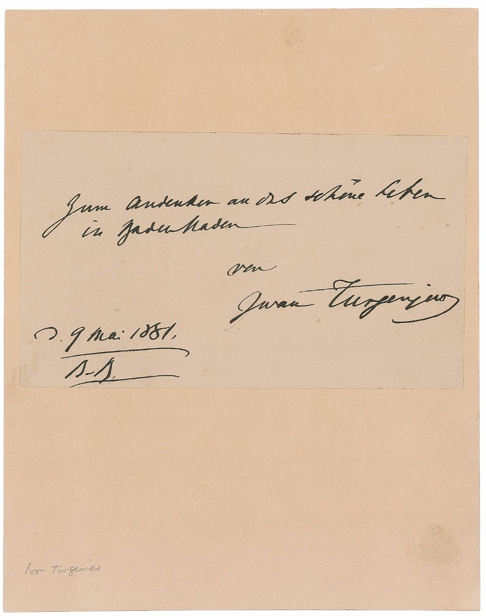 Exceptionally bold ink signature in German (translated), “In remembrance of our beautiful life in Baden-Baden, Ivan Turgenev, 9 May 1881, B-B.,” on an off-white 7.25 x 4.25 album page affixed to a larger off-white card. In fine condition. Turgenev split his time between Baden-Baden and Paris for most of the last two decades of his life, and drew inspiration from the German resort town as the setting of his 1867 novel Smoke.