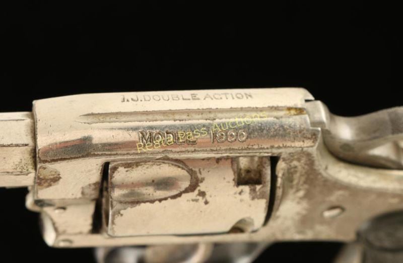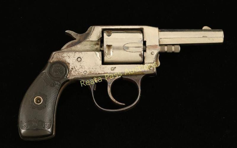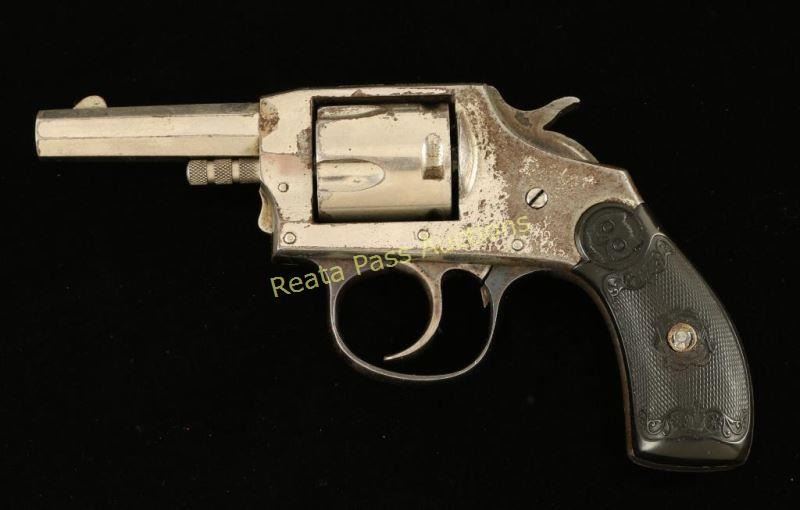 Vintage double-action revolver chambered for .32 centerfire. Features a nickel plated finish, 2.5" octagon barrel, blade front sight, channel cut rear sight, fluted five-shot cylinder, smooth case-hardened trigger, case hardened hammer with checkered spur, and ornate two-piece checkered black hard rubber grips. Revolver exhibits approximately 72% of is original finish showing major losses on the frame with a browning patina on the bare metal. Action functions well, bore is good and grips are good with worn checkering & the hardware heavily damaged. Condition is good. ***C&R Firearm*** ***Modern Firearm***