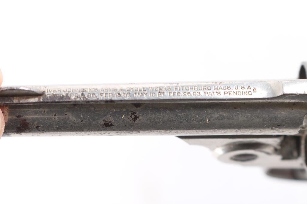 .32 S&W, SN: 30601. First model revolver, as indicated by the left side barrel latch, made in 1894 and 1895. Single and double action. 3” barrel in .32 S&W, cylinder holds 5 rounds. Bore is rifled with scattered pitting, nickel finish is about 80%, finish loss, dark spots of pitting, the left hard rubber grip has a 1/2" chip out of the bottom, the hammer action works fine with cylinder is removed, but does not rotate when installed.