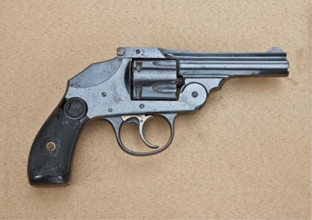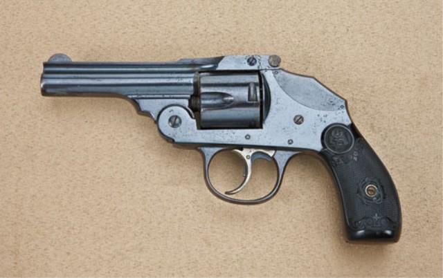 Iver Johnson .38 S&W caliber, double-action hammerless revolver, blued finish, gutta percha grips, serial #D16964. The pistol remains in very good plus original condition, 90-95% blue, some light pinprick erosion just starting, most of which should clean. The grips are fine to excellent, the action tight, trigger shows case hardening, the interior fine to near mint. Est: $150 - $300