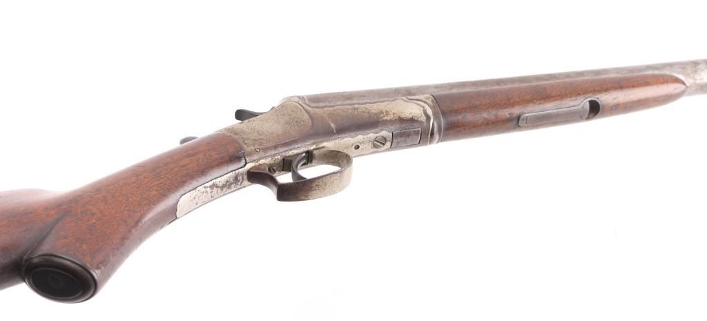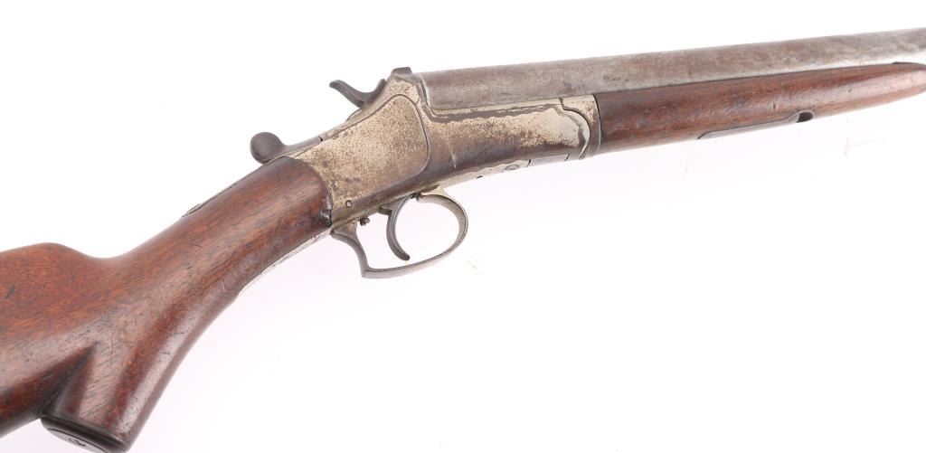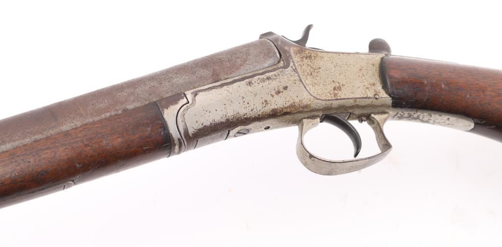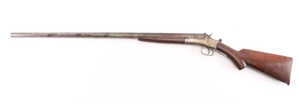 Single barrel break open shotgun features 30" barrel, brass bead installed, blued finish, nickel plated receiver plain wood stock & forend, plastic buttplate, side lever/triggerguard opening, exposed hammer. Bore is ok, needs cleaning. 'IC' choke. Bluing has turned an even patchy brown color. Nickel finish is starting to flake off. Wood is overall sound with scratches/dings, there is a 2" chip out of the bottom of the buttstock. Condition-Fair. C&R Firearms.
