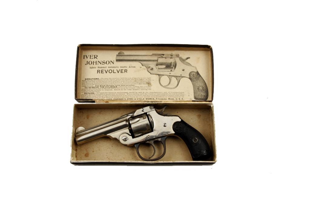 Iver Johnson DA Top Break Cal .32 SN:13677 Double action top break revolver. Nickel finish, black hard rubber grips, 3" barrel, fixed sight, good bore, working action. Condition: Very good with 95% finish just starting to lift in places, very good toDouble action top break revolver. Nickel finish, black hard rubber grips, 3" barrel, fixed sight, good bore, working action. Condition: Very good with 95% finish just starting to lift in places, very good to excellent grips. Complete in original Iver Johnson box with picture and instructions printed in the top. NOT FOR SMOKELESS POWDER.