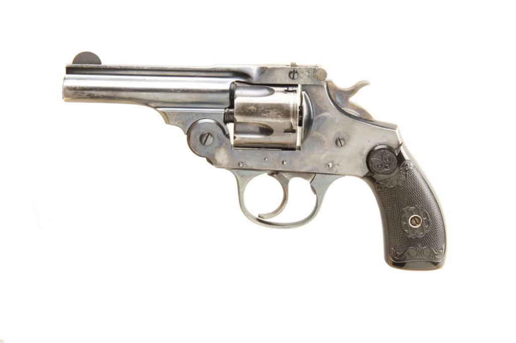 Iver Johnson DA top break Cal .38S&W SN:1929 Minty double action top break 5 shot revolver. Blued finish, black hard rubber checkered stocks, 3 1/4" barrel, fixed sights, good bore and action. Condition: Very good with 92% finish remaining with mostMinty double action top break 5 shot revolver. Blued finish, black hard rubber checkered stocks, 3 1/4" barrel, fixed sights, good bore and action. Condition: Very good with 92% finish remaining with most wear at the muzzle from holster carryand the cylinder ring. Some thinning on the cylinder and spots on the right side. Still very attractive and seldom seen in this condition!