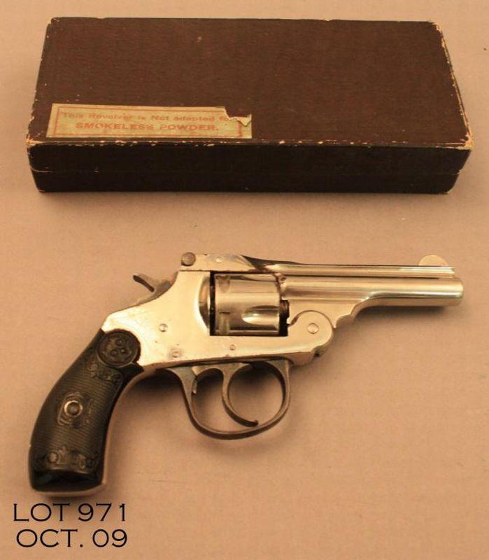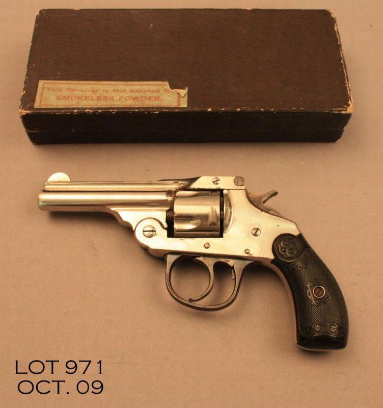 Iver Johnson DA top-break revolver, .32 cal., 3” barrel, nickel finish, black hard rubber grips, #13677. This gun is in overall very good condition showing approx. 95% original finish with very good bore, action, markings and grips. Accompanied by a correct Iver Johnson factory box that also is in very good condition. Est.: $200-$400.