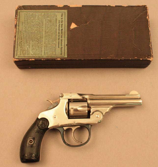 Iver Johnson DA top-break revolver, .32 cal., 3” barrel, nickel finish, black hard rubber grips, #14854. This gun is in overall like new condition showing little handling and is accompanied by a very good condition original factory cardboard box with just some scattered flaking of the brown covering primarily on the lid. Est.: $200-$400.