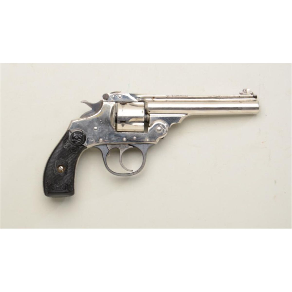 Iver-Johnson DA top break revolver, .32 cal., 4” barrel, nickel finish, checkered black hard rubber grips, #53724. This gun is in overall fine condition showing the majority of its original finish with some areas offlaking confined primarily to the top barrel rib; very good bore, action and markings; grips are fine and have been fitted to this gun; not Iver-Johnson owl’s head but period grips that look good on this piece. Est.:$75-$125.