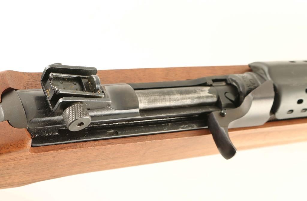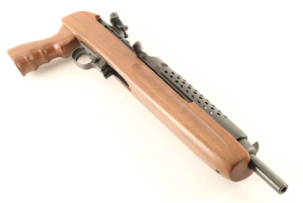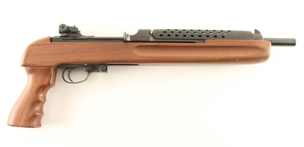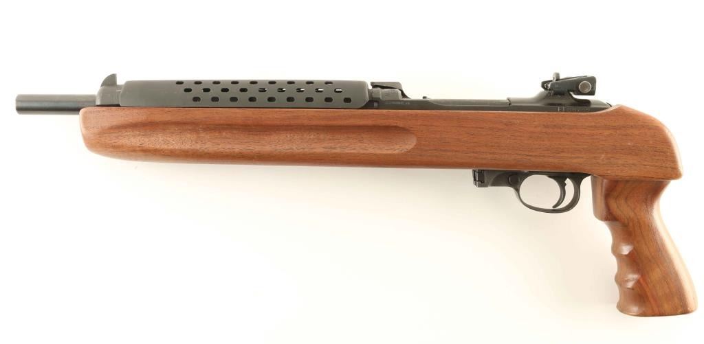 Commercial semi-automatic pistol variant of the U.S. M1 Carbine, chambered in .30 Carbine. Features a blued finish, 10 1/2" barrel, patridge front sight, adjustable rear aperture sight, smooth trigger, rotating style safety, round bolt, M1 magazine release, no magazine, ventilated metal hand guard and walnut stock with finger groove forend & grip. Pistol exhibits approximately 94% of it's original finish showing slide wear on the bolt and receiver. Action is smooth, the bore is excellent and the wood stock is near fine. Condition is NRA Very Good+++ ***Modern Firearm***