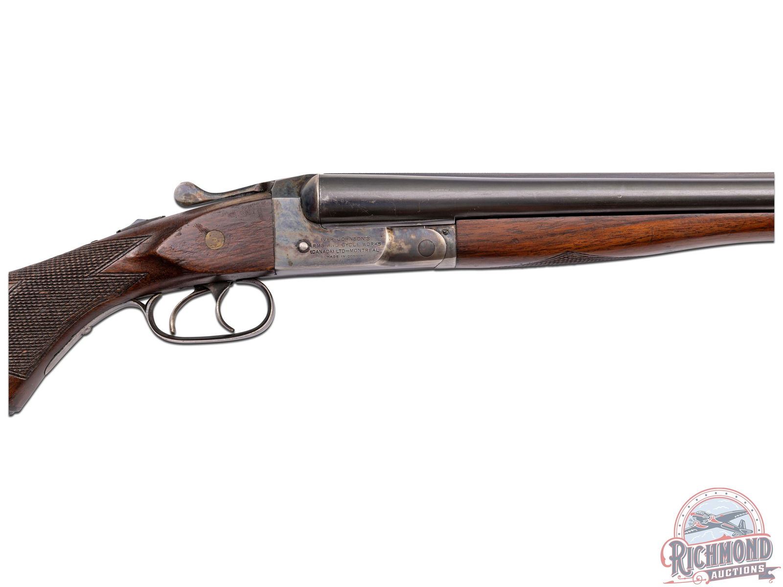 Made in Canada by Cooey for Iver Johnson Arms & Cycle Works between 1924 and 1935. 28" blued fluid steel barrels with matted rib, extractors, 2-3/4" chambers with Modified and Modified chokes. Case-hardened boxlock action with double triggers and automatic safety with action marked "Hercules Grade" and "Iver Johnson Arms And Cycle Works/Canada LTD-Montreal/ Made in Cobourge". Plain walnut checkered pistol grip stock with Iver Johnson Owl Head rubber butt plate and grip cap. Matching checkered splinter matching forearm with friction release. LOP: 14-1/4". DAC: 1-1/2". DAH: 2". CALIBER: 20 GA. S/N: 2000. FFL STATUS: Curio & Relic.