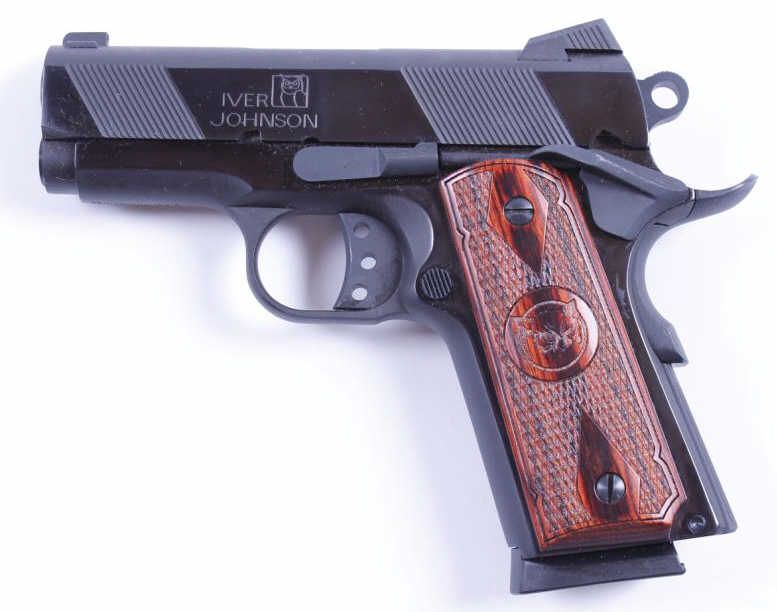 Iver Johnson Mdl Thrasher Cal .45acp SN:EP00025Single action semi automatic pistol, polished blue finish sides, matte finish on top and bottom, 3.25" flared barrel (no bushing), fixed sights, Novak style rear sight, forward serration's, checkered grip panels,beavertail grip safety, Commander style hammer, excellent bore and action. Includes box (numbered to the gun), manual, safety padlock. 1 magazine Condition: Near perfect.