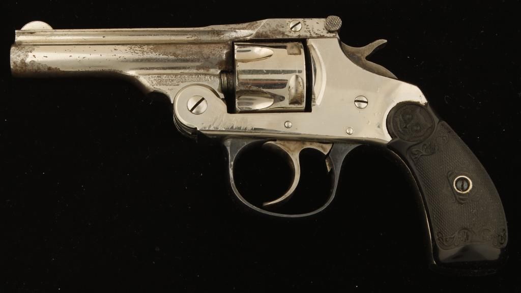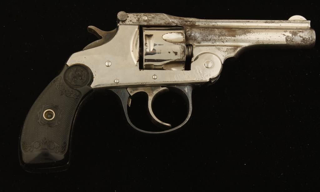 Double action top break 5 shot revolver circa 1900 with 3" round solid rib barrel. Nickel finish, checkered hard rubber "owl head" grips and fixed sights. Good bore and action. Condition: Good overall showing 70% finish and grips are very good with no loss. *Curio & Relic Firearm*