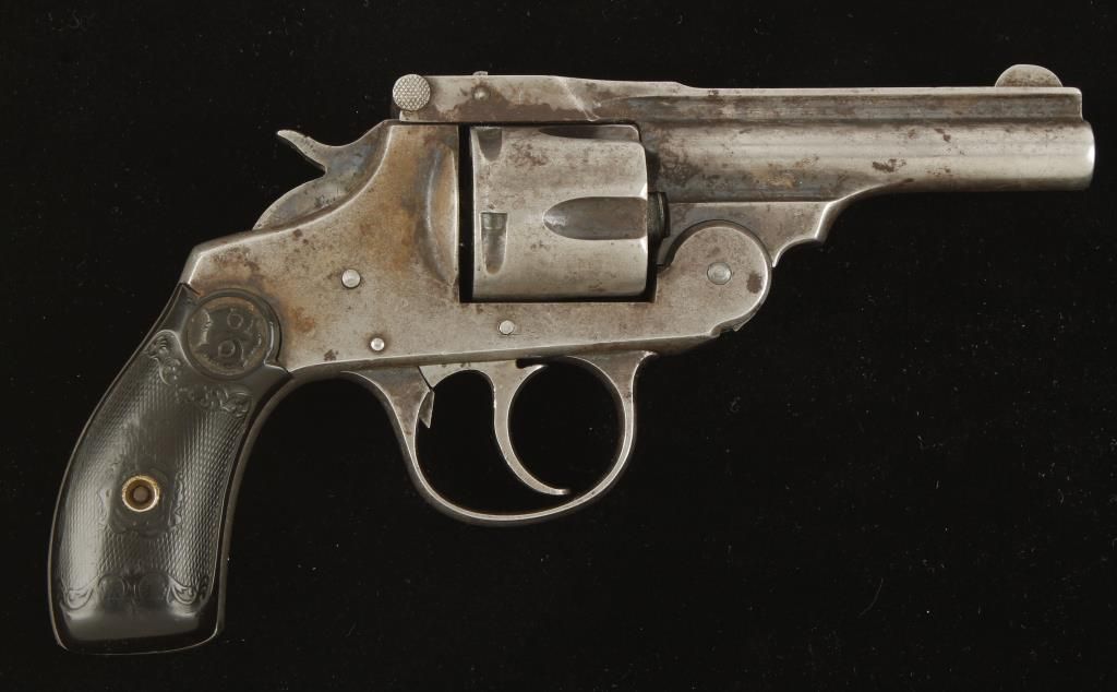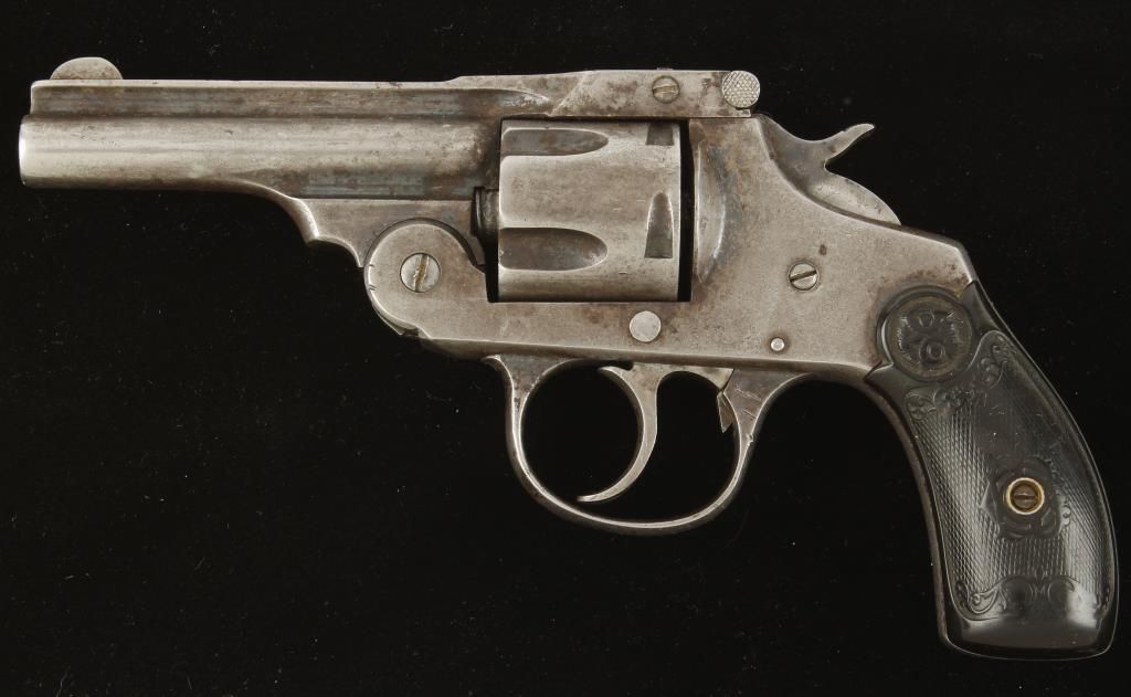 Double action top break 5 shot revolver made in early 1900's with 3-1/4" round solid rib barrel. Originally blued finish, checkered black hard rubber "owl head" grips and fixed sights. Dark bore and trigger return spring is weak. Condition: Fair showing less than 10% finish remaining and grips are fair as well worn. *Curio & Relic Firearm*