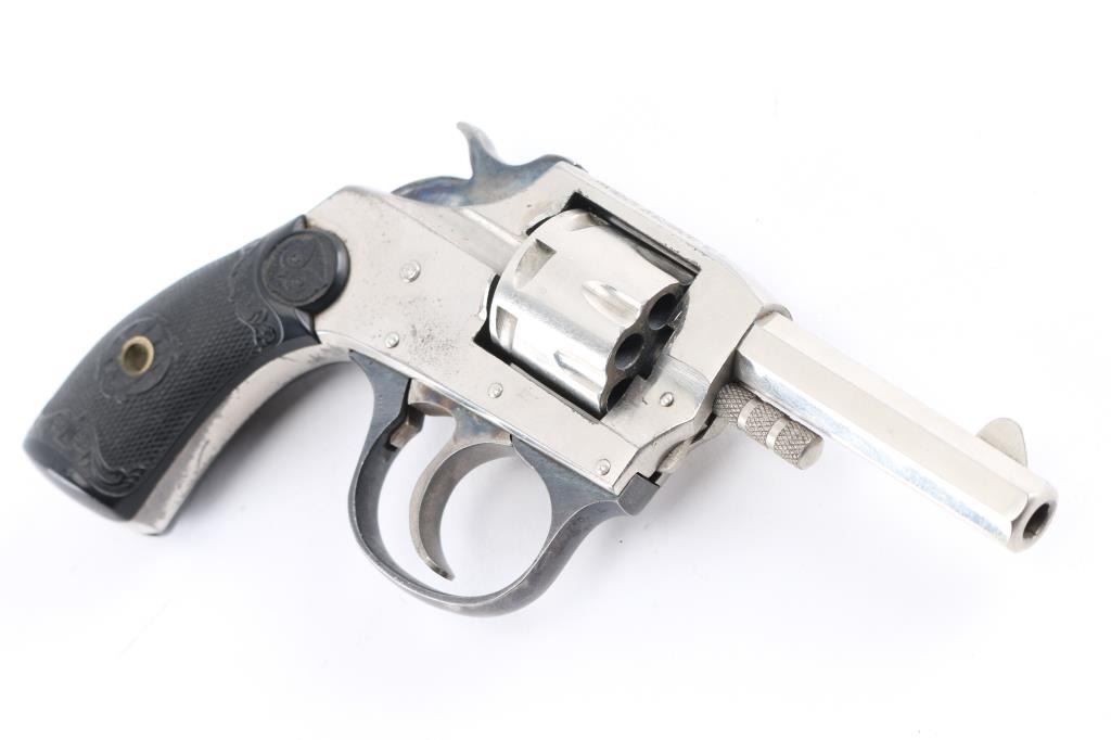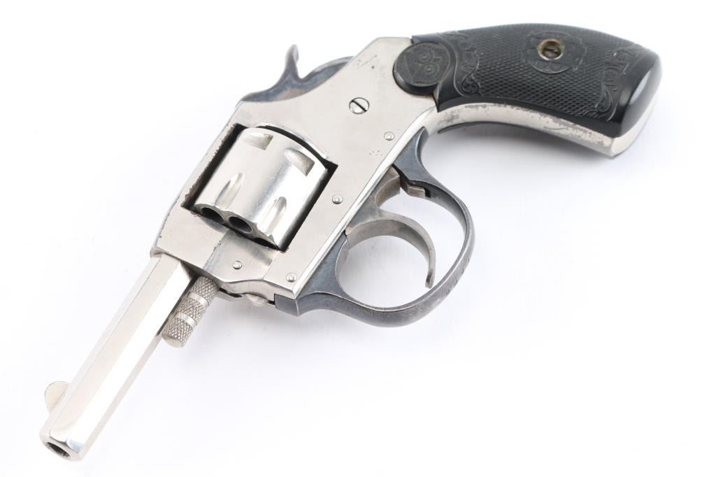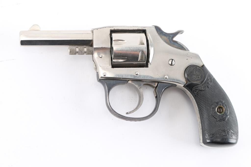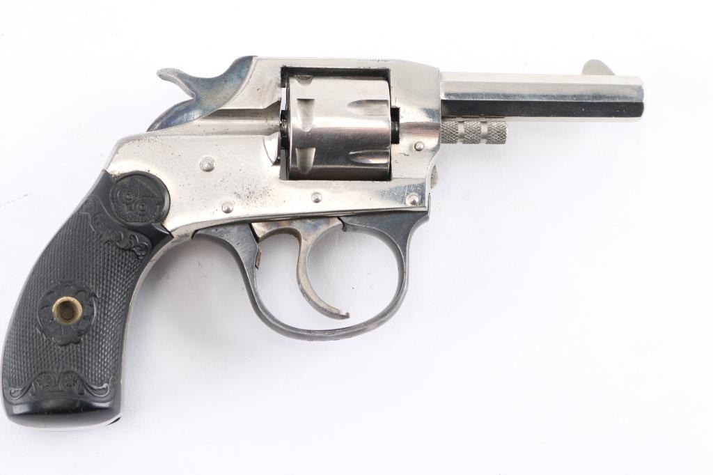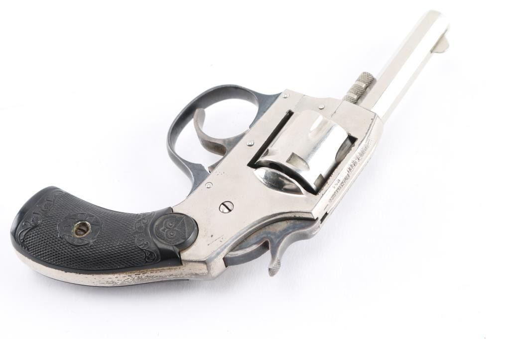 SN: 9983. Solid frame double action revolver manufactured circa 1900-1941. Features nickel finish, blued trigger guard, case color hammer & trigger, checkered black hard rubber grips with "owl's head" emblems, 2.5" octagon barrel, fluted 7 shot cylinder, loads thru relief on right side of frame. Fixed blade front sight, rear sight is a notch in the hammer nose. Bore is fair to good/bright, some scattered light pitting. Nickel is very good overall, with wear on the backstrap, scratches. Blued triggerguard good with light wear on the bottom. Good case colors on hammer and trigger. Grips are very good. Action is smooth with good lock-up.