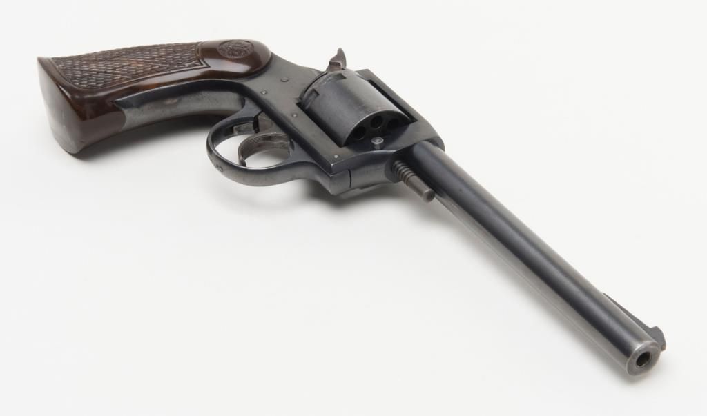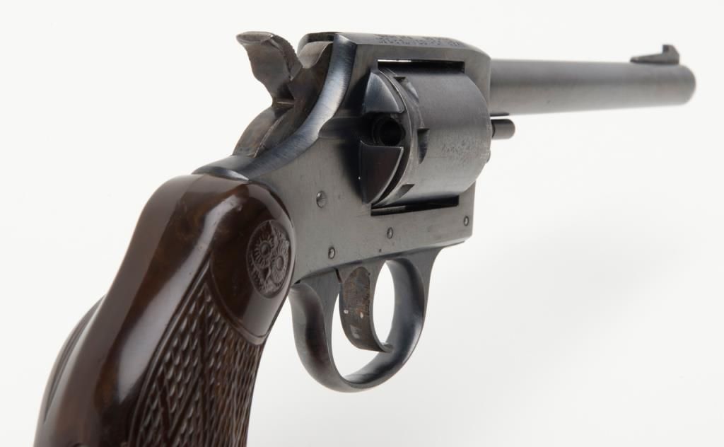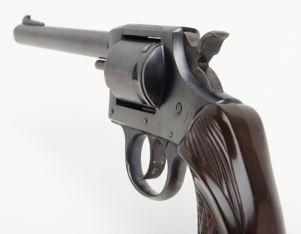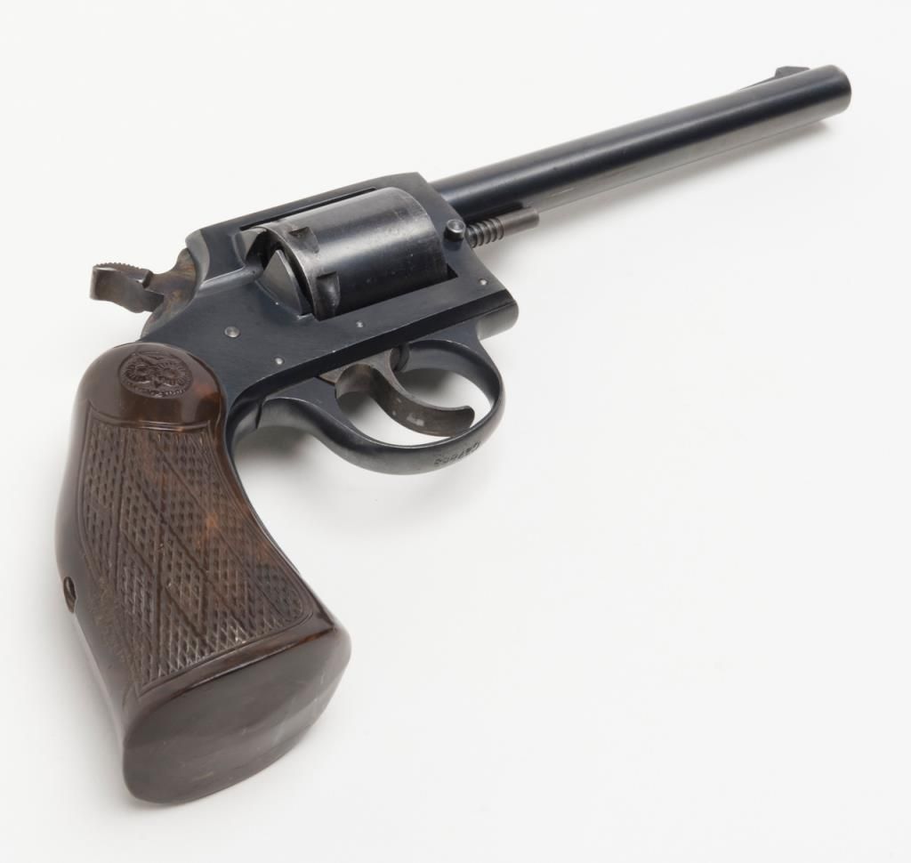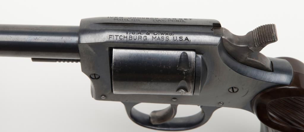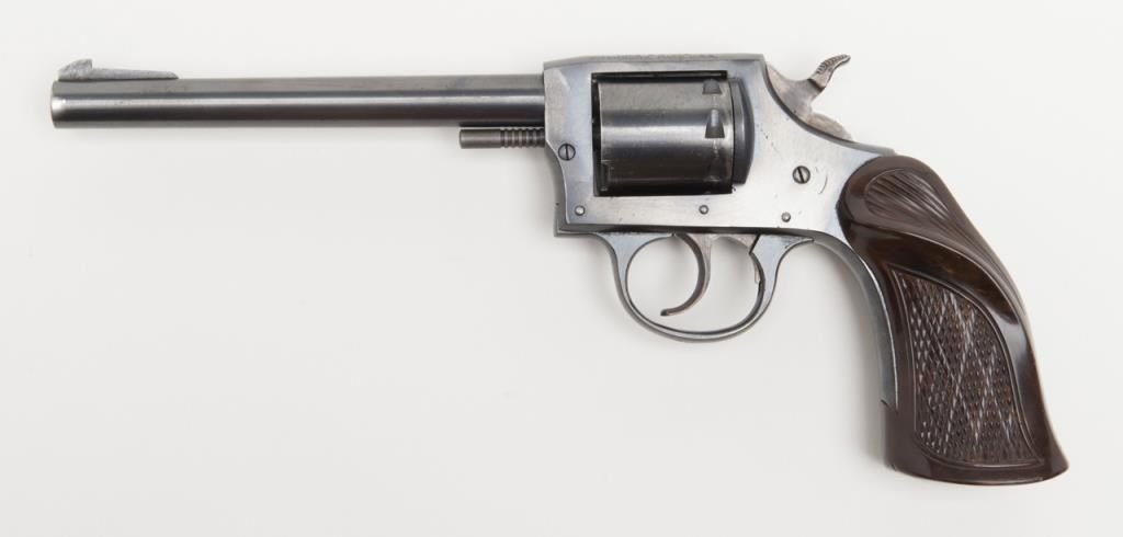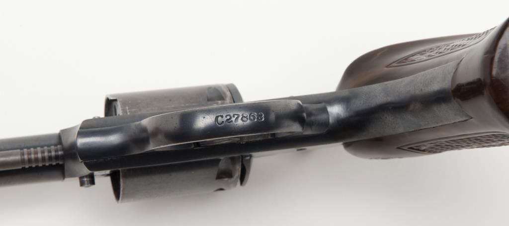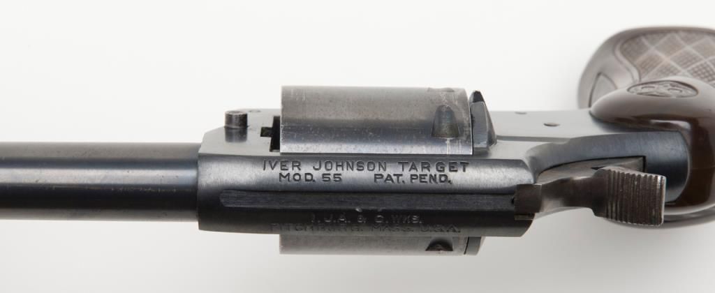 Iver-Johnson Model 55 Target DA revolver, .22 cal., 6” barrel, blue finish, checkered thumb rest brown plastic grips, #C27863 in overall fine condition showing the majority of its original finish, fine bore, crisp action, sharp markingsand fine grips; trademark owl’s head on top of right grip. (C&R/PPT). Est.: $100-$150.