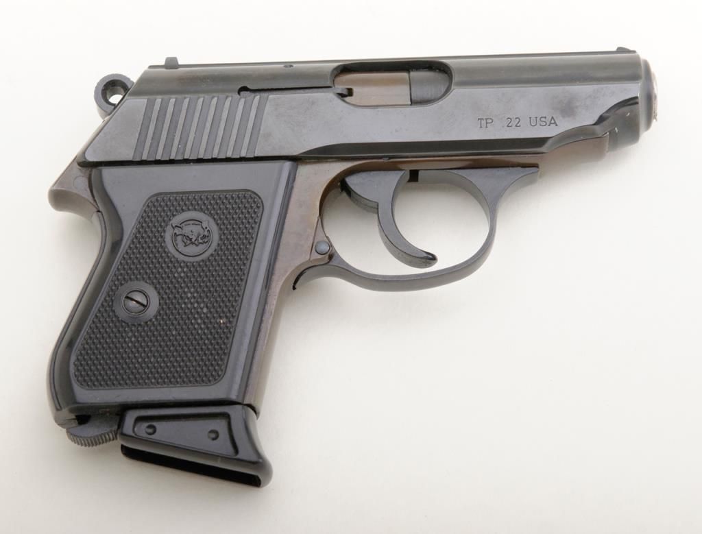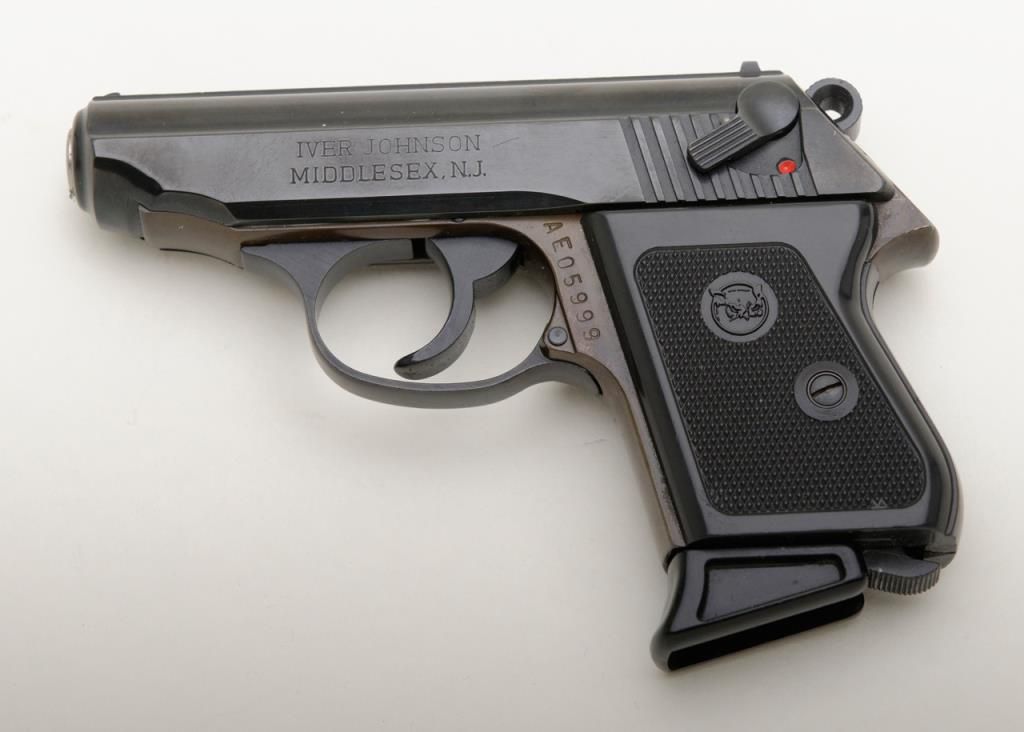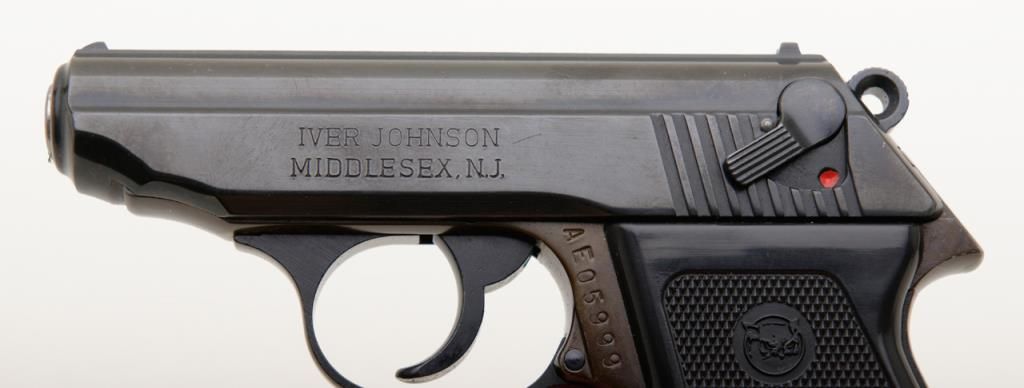Iver-Johnson Model TP-22 DA semi-auto pistol, .22 cal., 3” barrel, blue finish, checkered plastic grips, #AE05999 in overall fine condition showing the majority of its original finish, fine bore, action, markings and grips; (consecutive serial number to Lot 1709). Est.: $150-$300.
