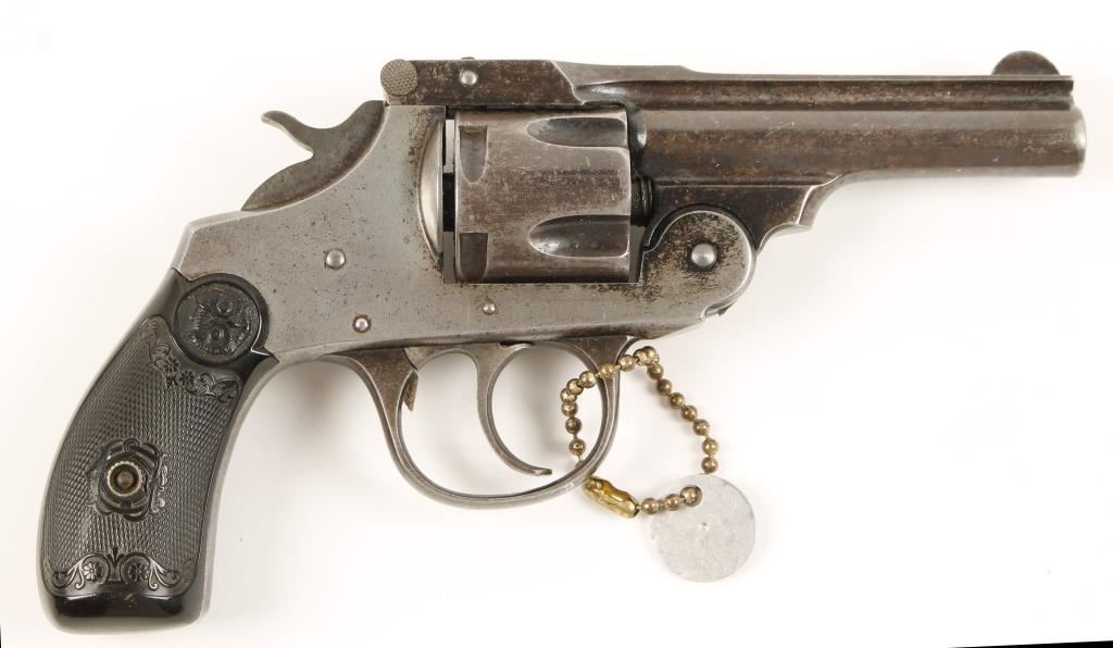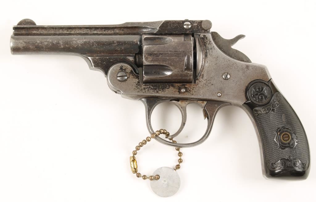 Blued double-action 5-shot top-break revolver with a 3-1/4" barrel. Finish on barrel and cylinder is worn to a mottled patina with edge wear. The finish on the frame has residual bluing in protected areas only, other wise has been worn to bare metal with light pin-prick pitting. The bore and chambers are in good condition and there is good rifling. The function is smooth and tight. The grips are checkered hard rubber with worn checkering and one ding. Condition is fair to good. *Modern Firearm*