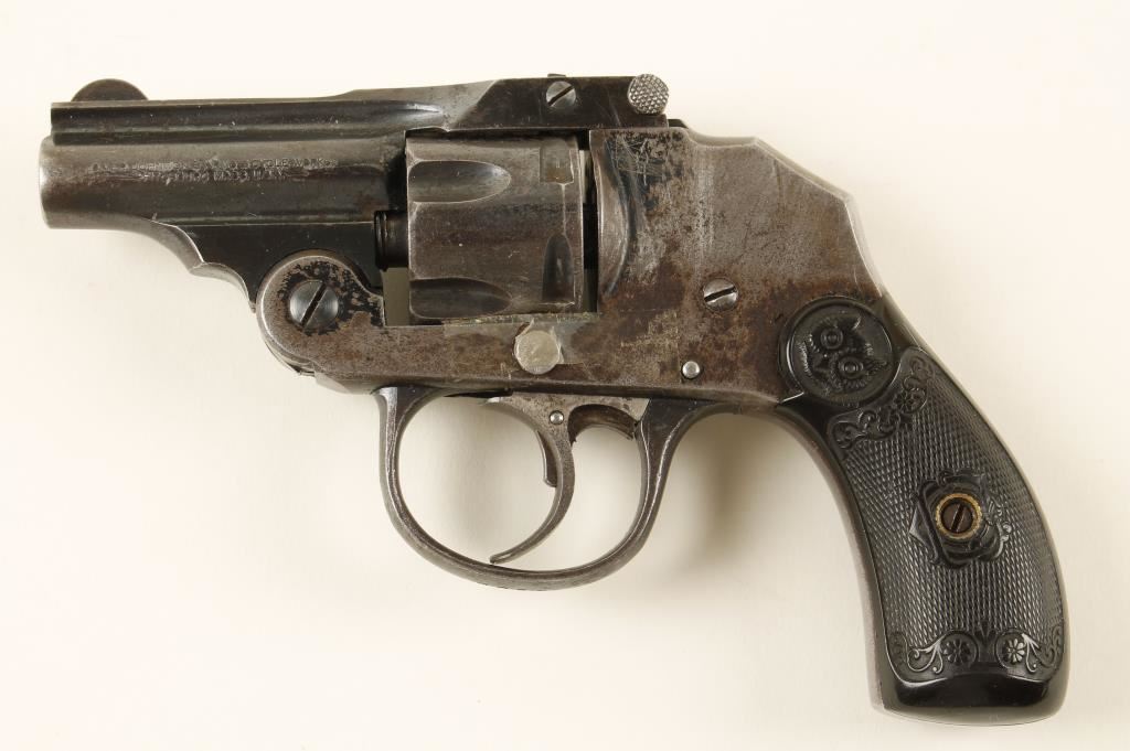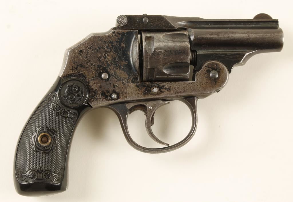 Blued double-action only top-break 5-shot revolver with a 2" barrel and hard rubber grips. The bluing is worn and faded on the barrel, trigger guard and cylinder, mostly gone back to bare metal on the frame and trigger. The trigger pin is a nail held in with a piece of Scotch tape. Bore is shiny with one small spot of pitting. the chambers are pristine. The "Owl Head" grips are 100% complete with very little wear. The trigger doesn't reset itself at the end of the firing cycle, everything else works well. Lock-up is a little sloppy but that may be the fault of the undersized "trigger pin". Condition is fair. *Modern Firearm*