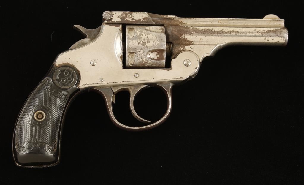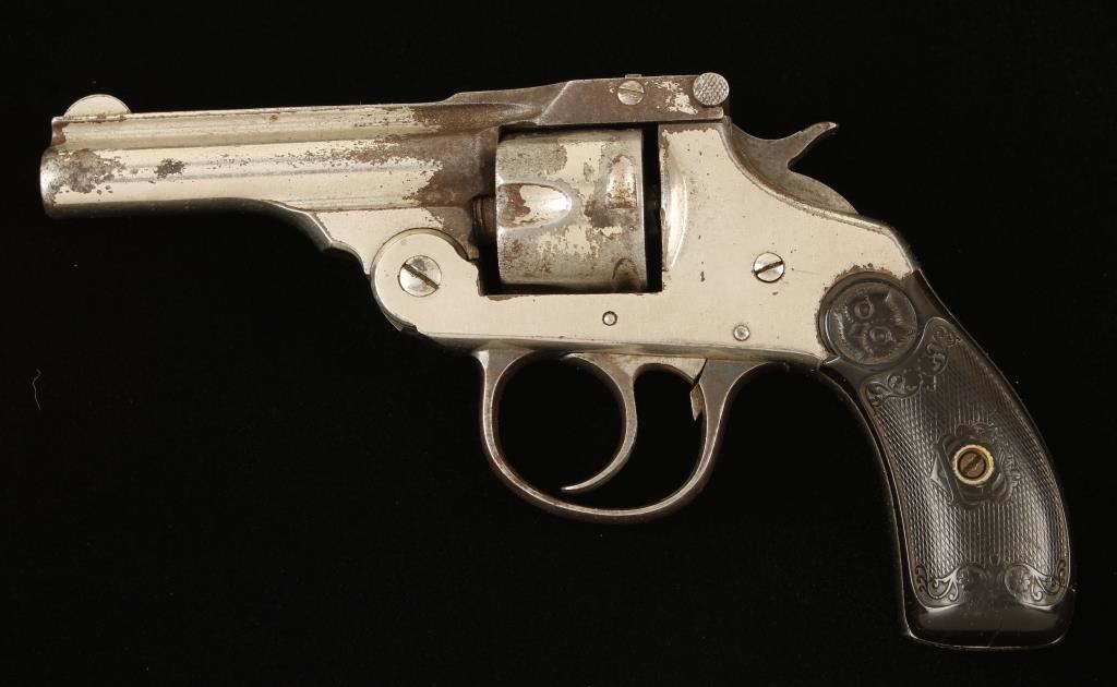 Nickel plated double-action top-break 5-shot revolver with a 3" barrel and hard rubber grips. Plating is worn and flaking over most of the cylinder and much of the barrel. The frame has edge wear to the plating and is freckled overall. The blued trigger guard is fading to grey leaving a mottled appearance. The "Owl Head" grips are worn and the left grip has a crack at the bottom. The bore is shiny with strong rifling and light-moderate pitting. Chambers are grey but un-marred. The cylinder retaining threads below the barrel are stripped and the cylinder rises out of the frame when the action is opened. The barrel is loose in the frame. Action works well but the lock-up is poor. Condition is poor. *Modern Firearm*