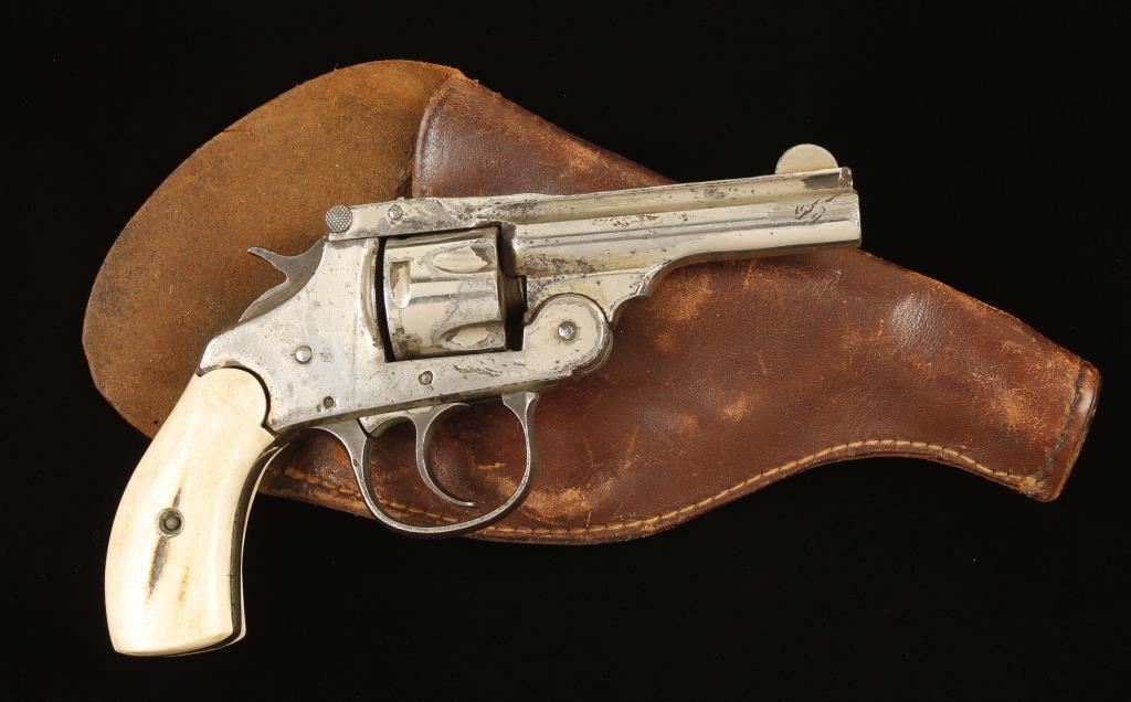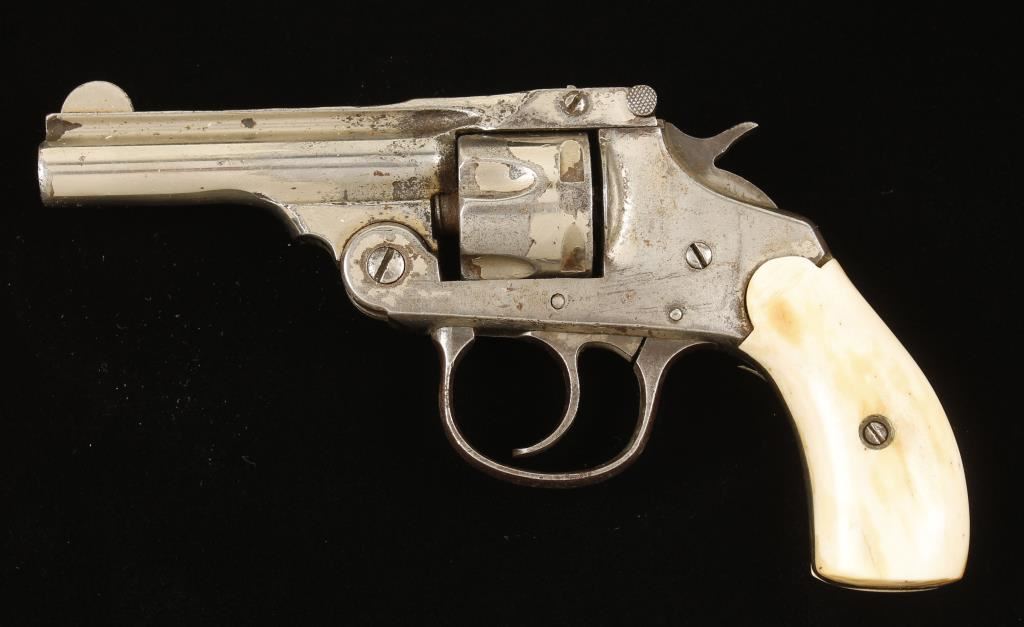 Nickel plated double-action only top-break 5-shot revolver with a 3" barrel and stag grips. Plating has flaked or worn off much of the frame leaving pitting. Barrel plating has flaking and abrasion with pitting. Cylinder has wear and flaking. Remaining plating is scratched and a little dull. Bore is dark with rifling and considerable pitting. Chambers are dirty and dark with pitting. Action is missing the single-action sear but works well in double action with sloppy lock-up. Grips are a little oversized on the edges and not quite abutting the frame on the top. Includes a leather holster marked "HSB & Co. REV-O-NOC". Condition is poor. *Modern Firearm*