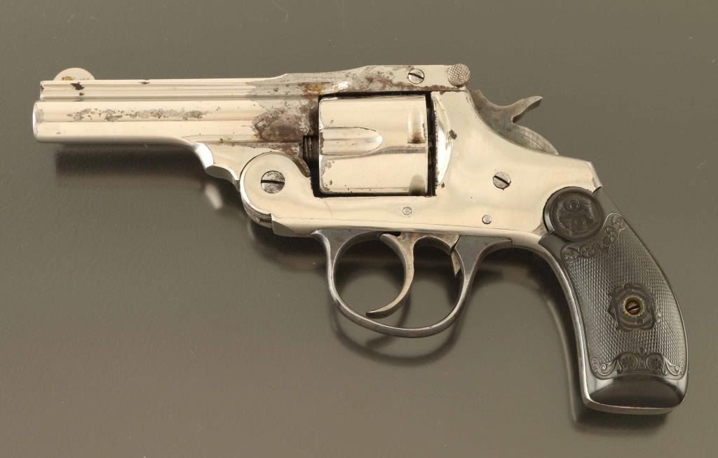 SN: C45471 Double/Single action break top revolver features nickel (or chrome) finish, black checkered Gutta Percha grips with Owl's Head logo, 3.25" barrel, fixed sights, 5 shot cylinder. Bore is good condition with strong rifling, some frosting. Charge holes are good condition. Nickel finish is fair to good with peeling and flaking to reveal brown patina on barrel at breech end, on top strap. Trigger guard is blued, very good condition. Grips are fair condition, right panel is cracked. Action operates properly, fairly smooth, with loose cylinder lock-up. Condition is NRA Fair++ *** C&R Firearm ***