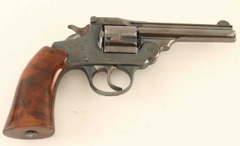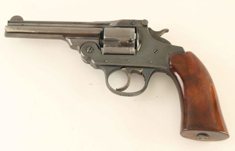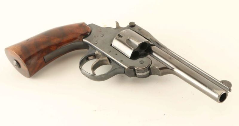 SN: H89334 'Third Model' Vintage double action top-break revolver chambered in .38 Smith & Wesson, manufactured circa 1909-1941. Features a blued finish, ribbed 4" barrel, round blade front sight, square notch rear sight on "T" shaped barrel latch, smooth case hardened trigger, case hardened hammer with knurled spur, fluted five-shot cylinder with automatic extractor, and oversized one-piece smooth walnut grip. Revolver exhibits approximately 70% of it's original finish showing holster & handling wear. Action is sound with good lock-up, the bore is excellent and the select walnut grip is very good. Condition is NRA Very Good. ***C&R Firearm***