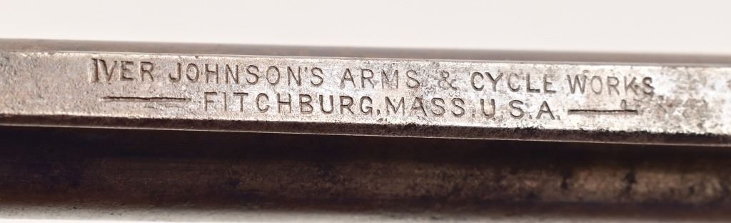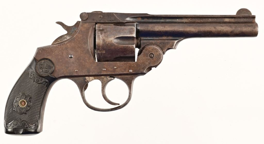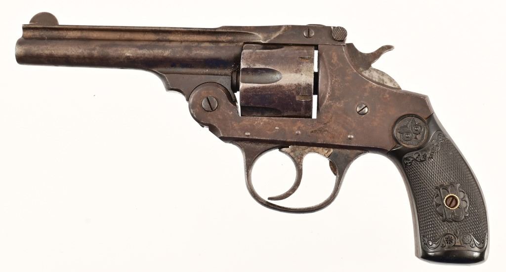 2nd model, top-break automatic eject. 4" barrel marked "Iver Johnson's Arms & Cycleworks, Fitchburg, Mass, U.S.A.", blued finish that has faded into a mottled patina. Iver Johnson owl-head grips. S/N 57145, antique.