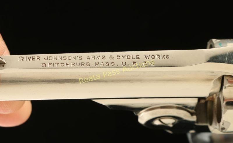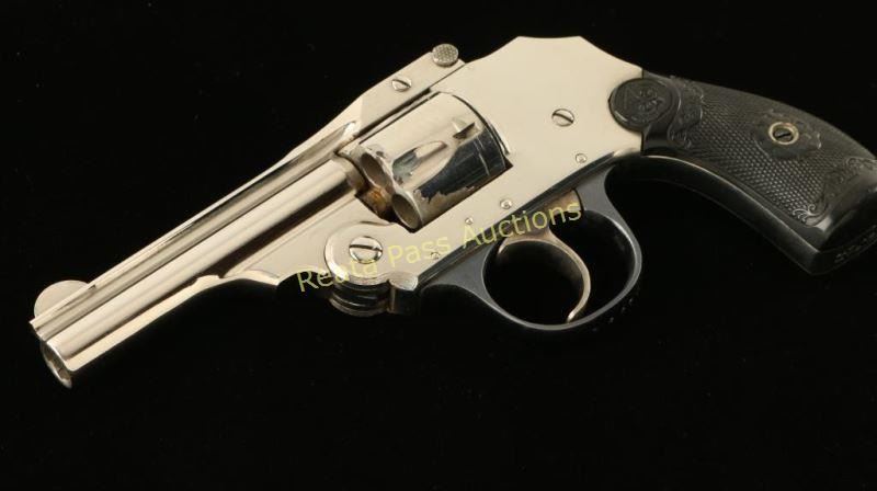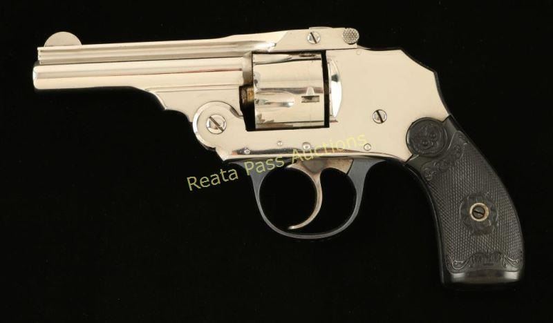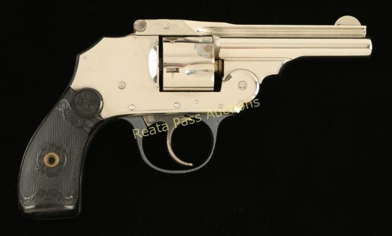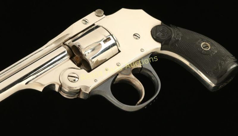 SN: 18670 'Third Model' Concealed hammer double-action revolver chambered in .32 centerfire, circa 1909-1941. Features a nickel plated finish, 3" ribbed barrel, blade front sight, notched rear sight, fluted five shot cylinder, smooth case hardened trigger, blued triggerguard, double top post barrel latch and fancy checkered black hard rubber grips with owl's head motif. All matching serial numbers. Revolver exhibits approximately 90% of it's bright nickel finish with some flaking on cylinder ad some other small scattered losses. Action performs well with good lock-up, bore is very good with a couple areas of light pitting and grips are near fine. Condition is very good. ***C&R Firearm*** ***Modern Firearm***