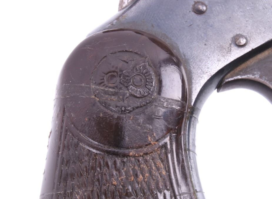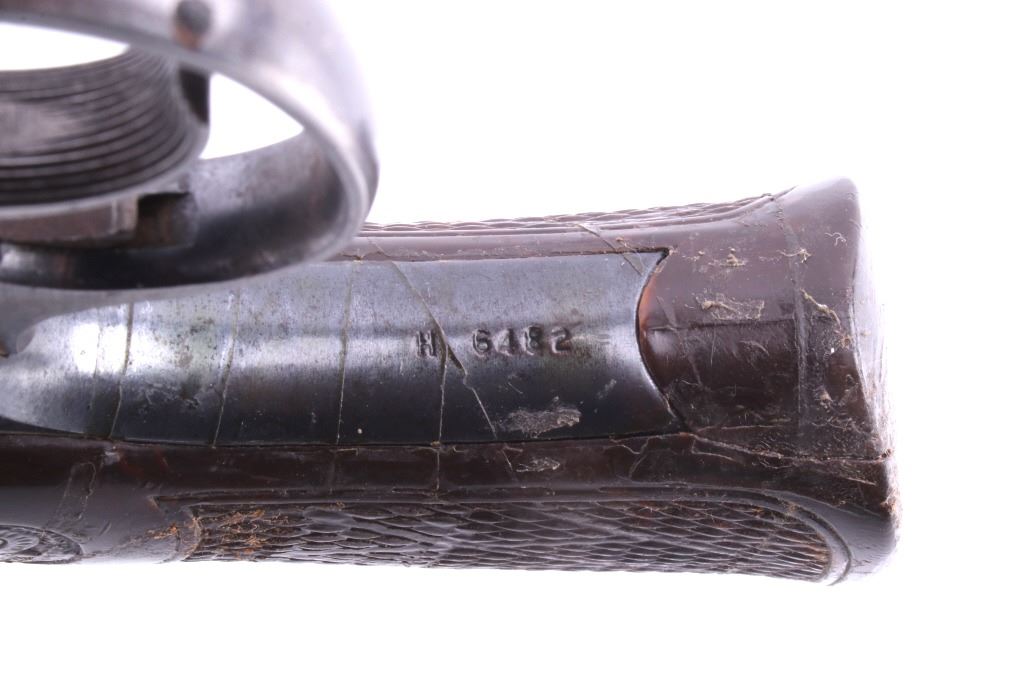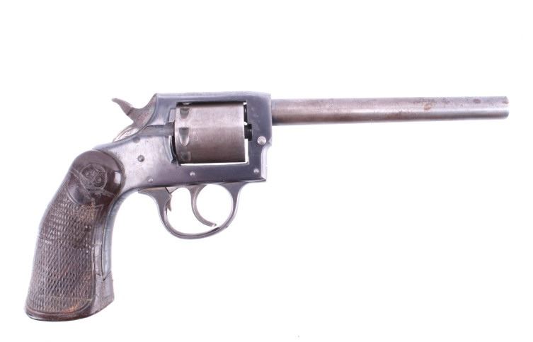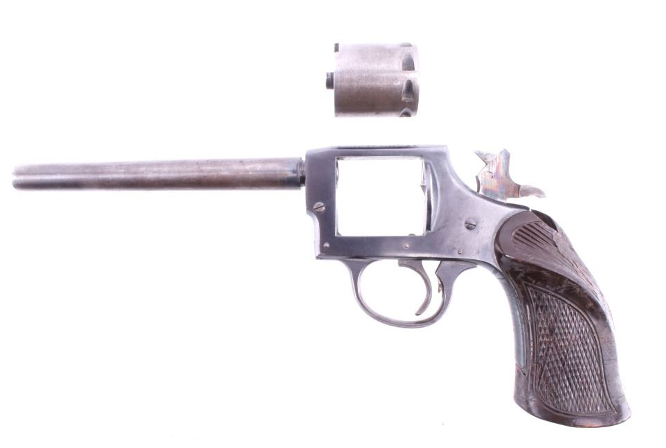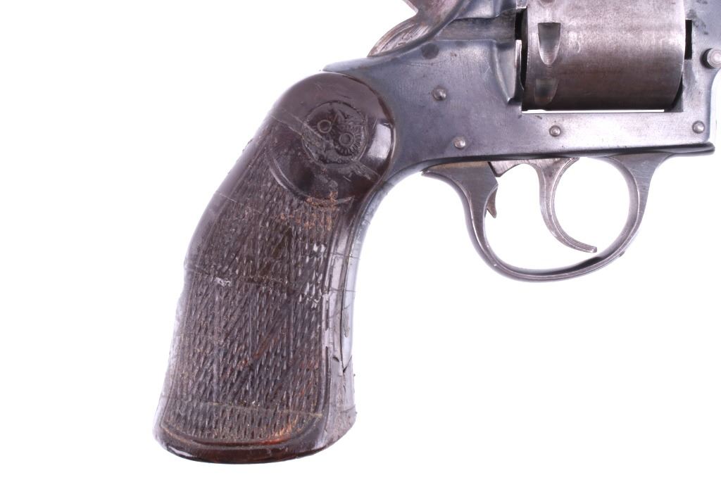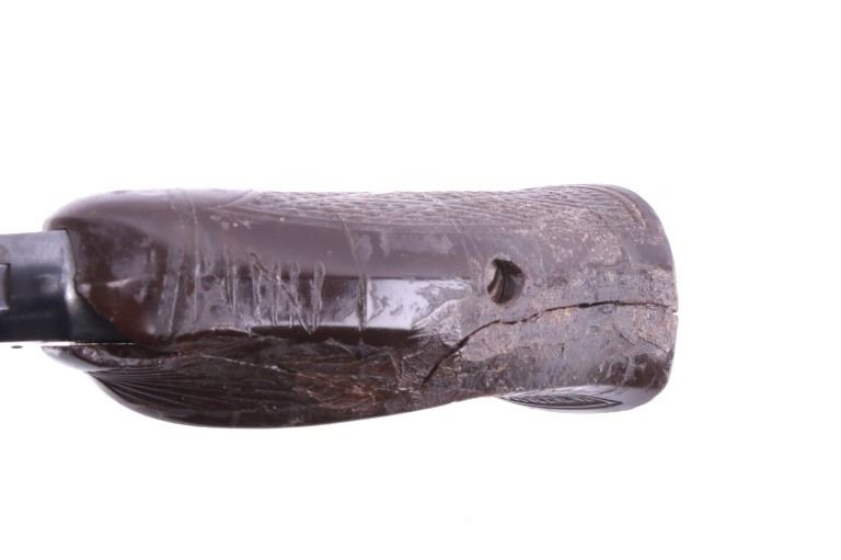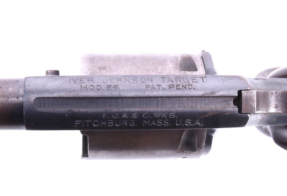 Featured in this lot is this Iver Johnson Arms Inc. "U.S. Revolver Co." double action Mod. 55 Target .22 caliber rimfire revolver. The model 55 Target was introduced in March of 1955 as the first of the 50 series, solid frame double action revolvers. The revolver shows a .22 rimfire caliber with a 6" removable barrel and a blue finish to the barrel, trigger, trigger guard, and hammer. The revolver features its original "Owl Head" Tenite, right handed pistol grip with a poorly repaired vertical crack in it. The revolver is marked on the top “Iver Johnson Target Moc. 55 Pat. Pend. I. J.A. & C. WKS. Fitchburg. Mass. U.S.A” and shows its serial number: H 6482. The revolver shows the cylinder ejection rod missing, so when the trigger is squeezed the cylinder doesn't rotate. Curio & Relic Handgun FFL Transfer or NICS Background required.