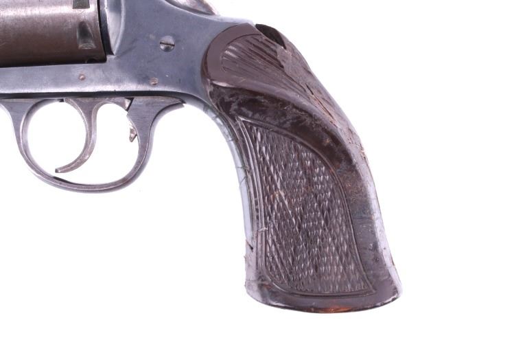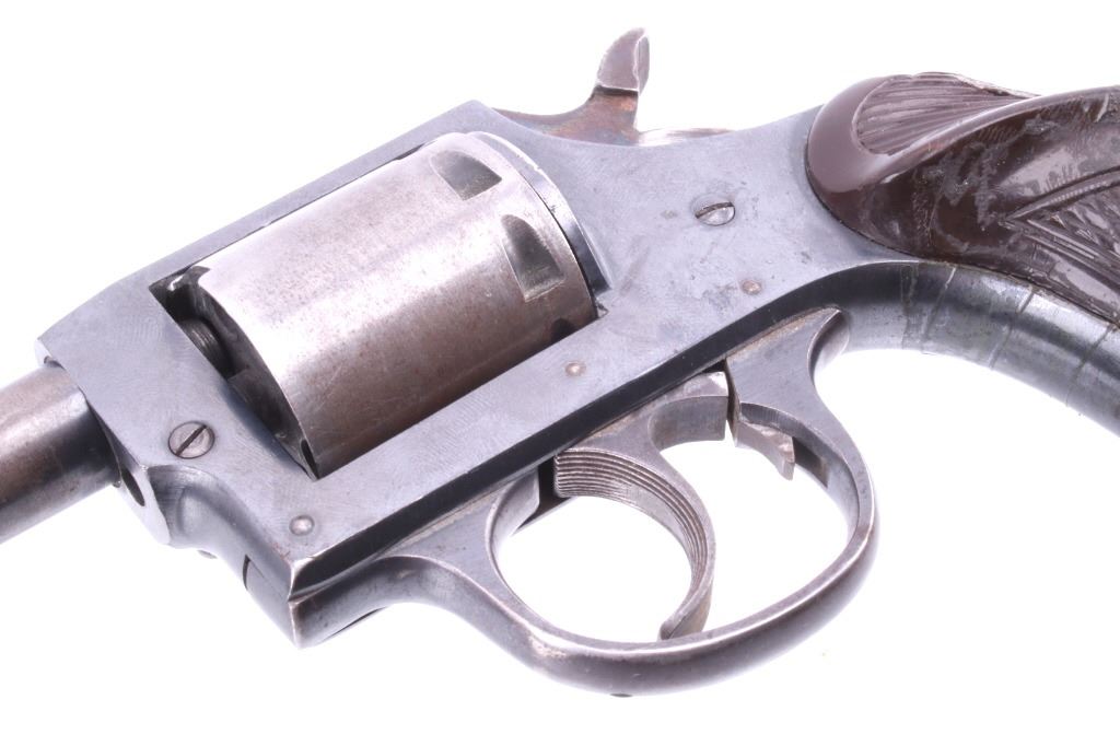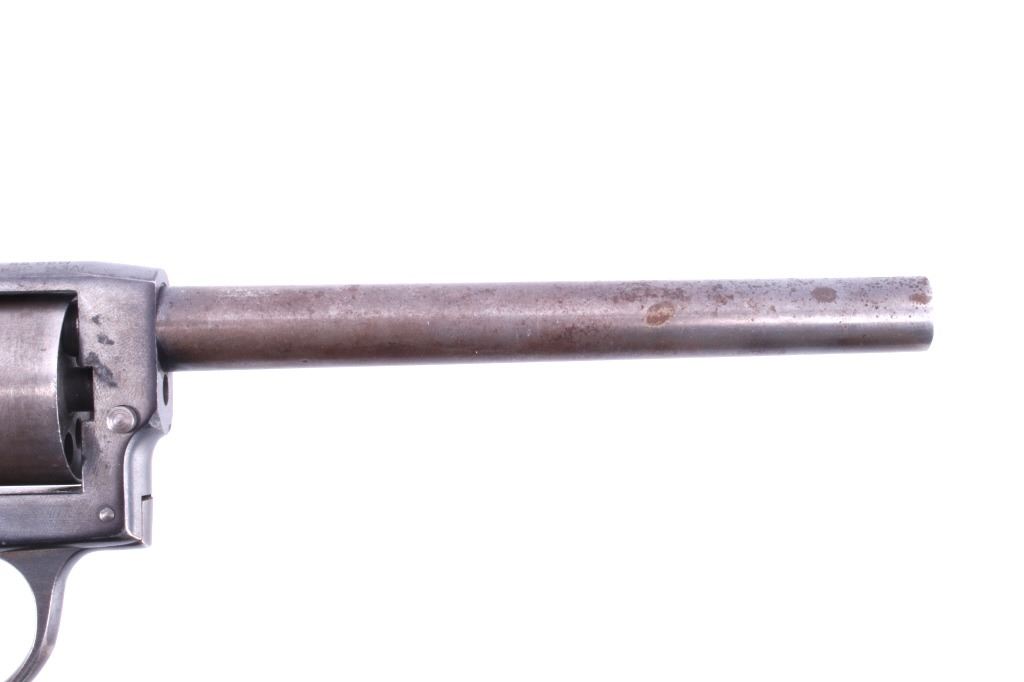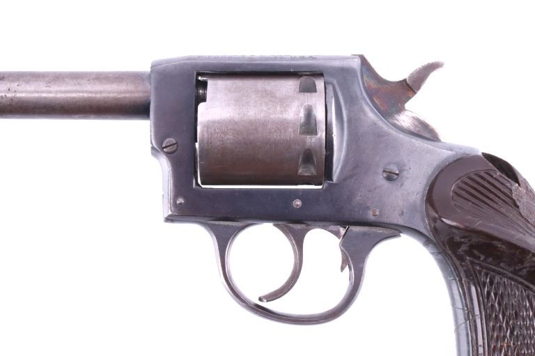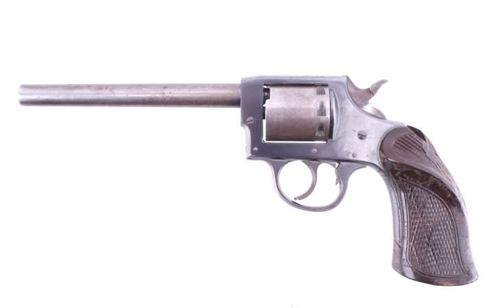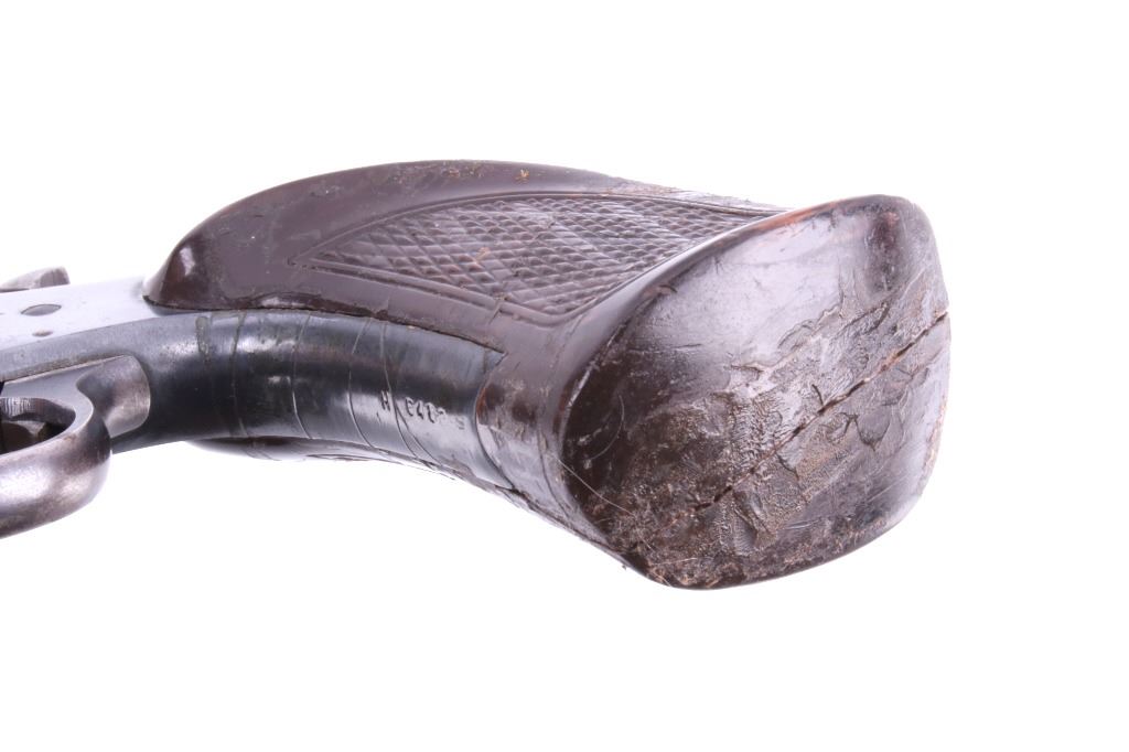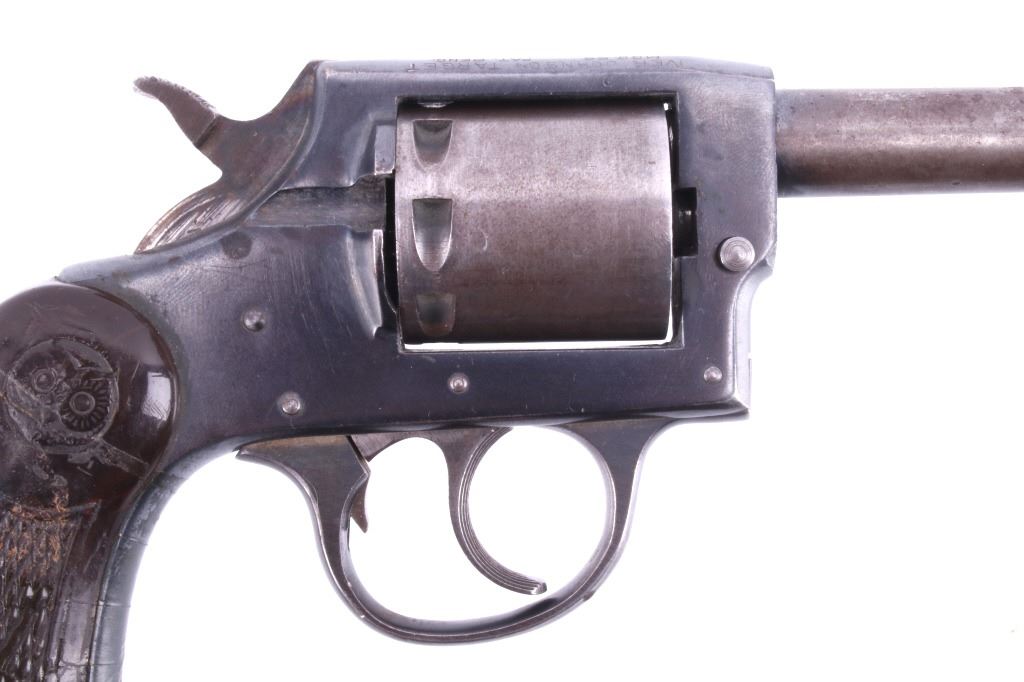 Featured in this lot is this Iver Johnson Arms Inc. "U.S. Revolver Co." double action Mod. 55 Target .22 caliber rimfire revolver. The model 55 Target was introduced in March of 1955 as the first of the 50 series, solid frame double action revolvers. The revolver shows a .22 rimfire caliber with a 6" removable barrel and a blue finish to the barrel, trigger, trigger guard, and hammer. The revolver features its original "Owl Head" Tenite, right handed pistol grip with a poorly repaired vertical crack in it. The revolver is marked on the top “Iver Johnson Target Moc. 55 Pat. Pend. I. J.A. & C. WKS. Fitchburg. Mass. U.S.A” and shows its serial number: H 6482. The revolver shows the cylinder ejection rod missing, so when the trigger is squeezed the cylinder doesn't rotate. Curio & Relic Handgun FFL Transfer or NICS Background required.