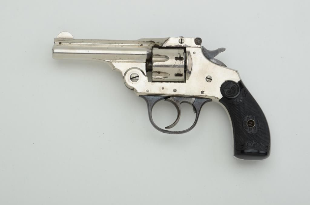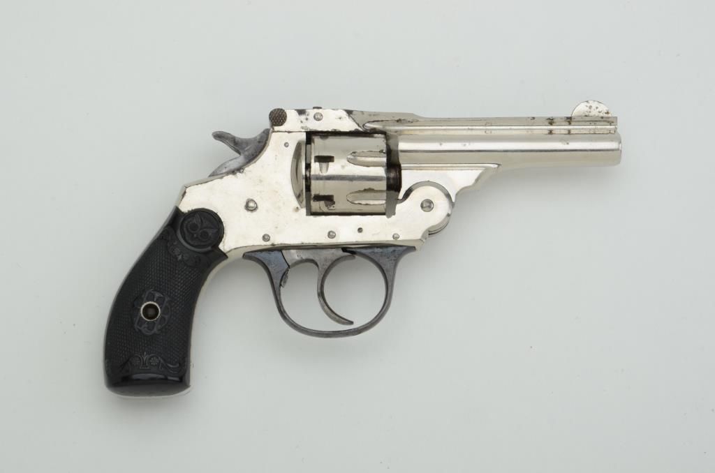 Iver-Johnson Top Break DA revolver, .22 cal., 3” barrel, nickel finish, checkered owl’s head hard rubber grips, #1772. This gun is in overall very good condition showing the majority of its original finish with someslight scattered flaking; good action, bore and markings; very good + grips. Est.: $75-$125.