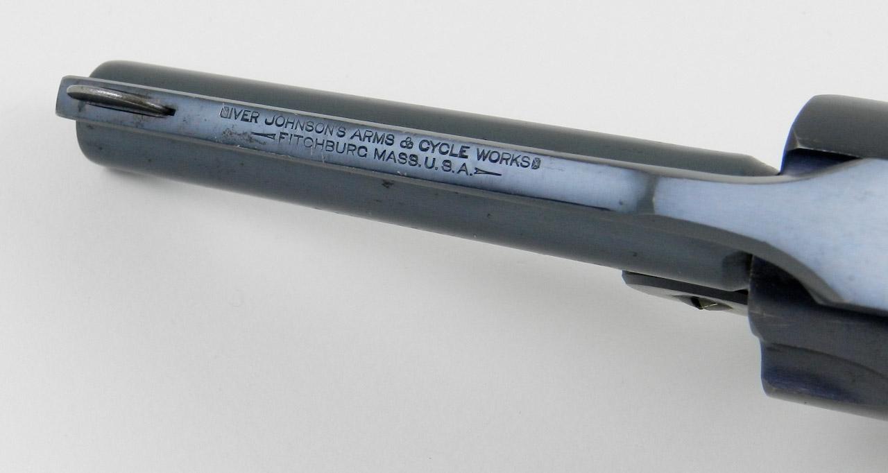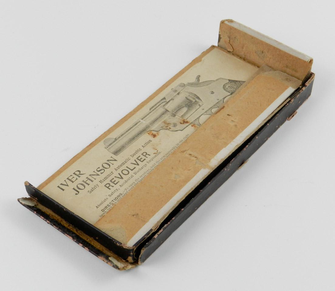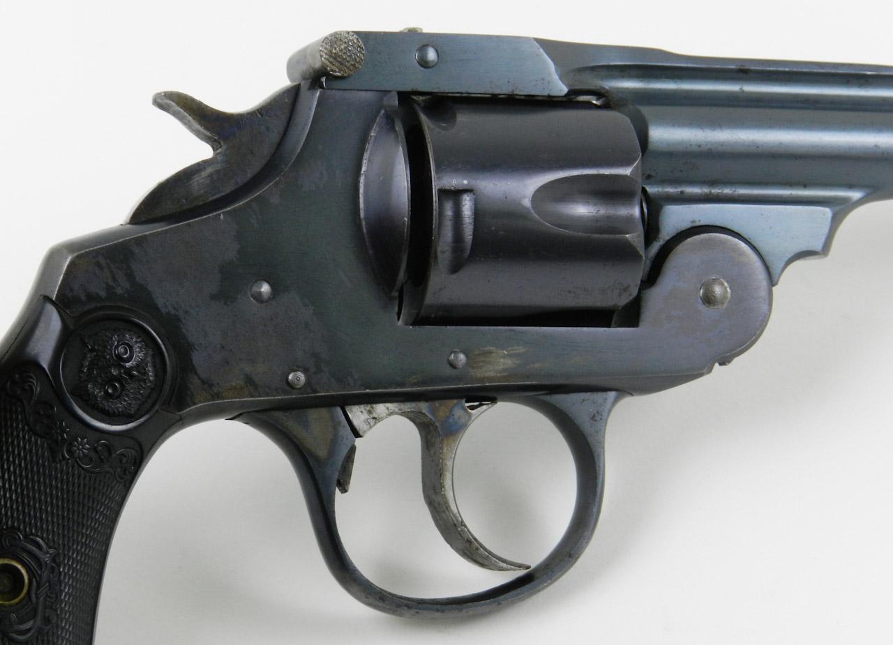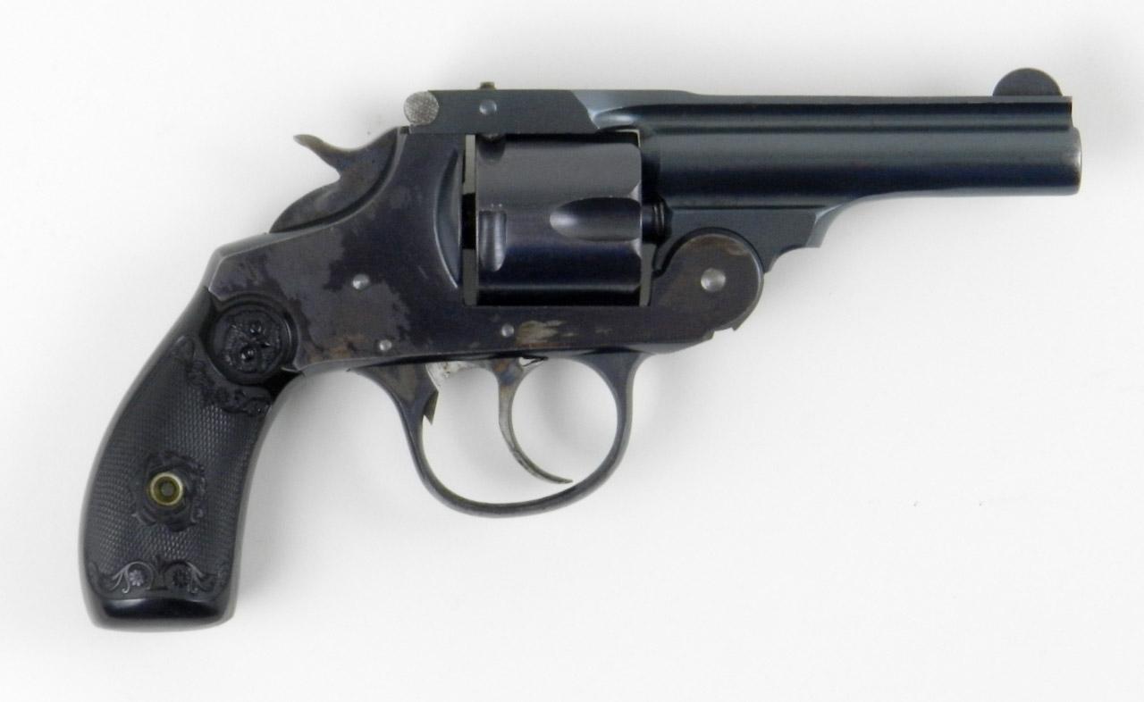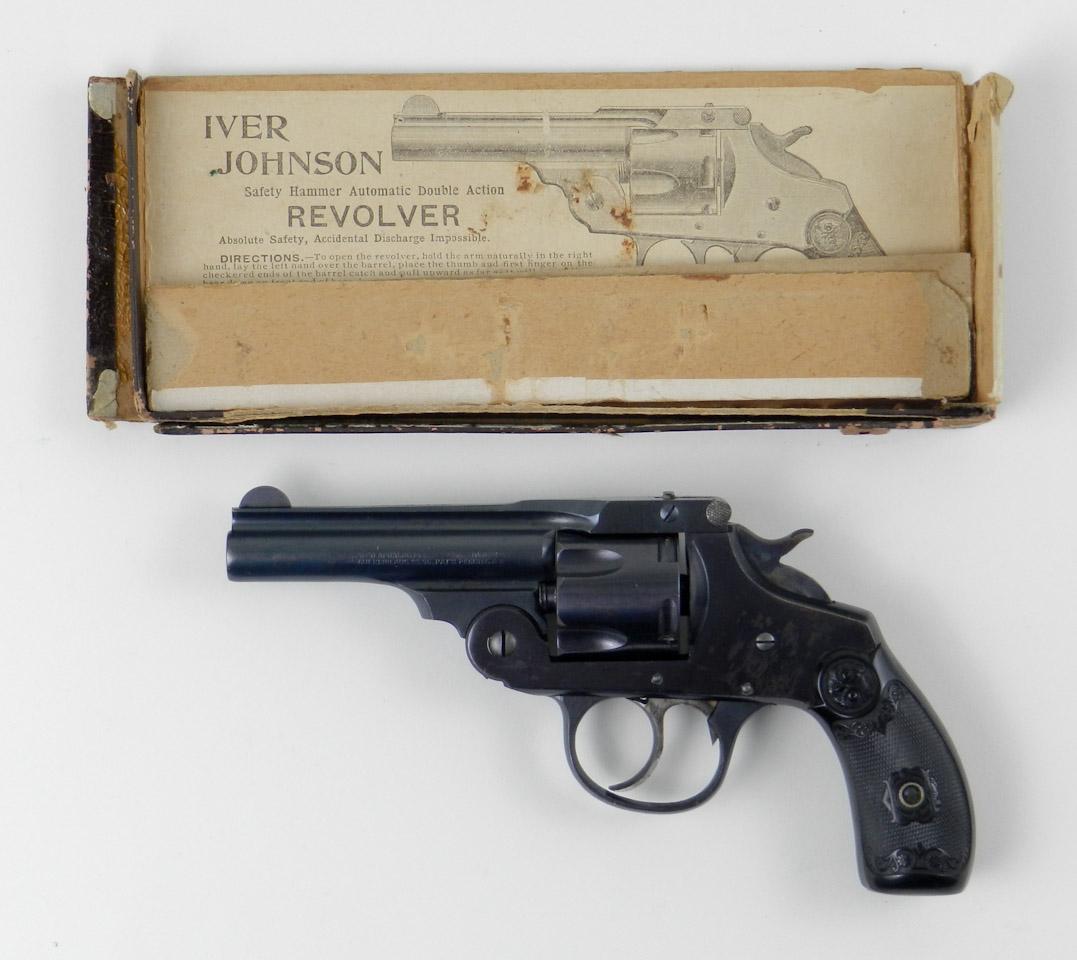 Iver Johnson Top-Break Double Action Revolver, #132041, .32 cal., 3-1/4'' barrel, blue finish, with owl checkered hard rubber grips. Original box is present. Condition is very good to fine retaining approx. 90% blue finish with partial flaking to right side of frame; a little less to left. Grips show light wear. Action is tight, bore is fine and should clean a little. Box is mostly present but needs reassembly. Est.: $150-$300.