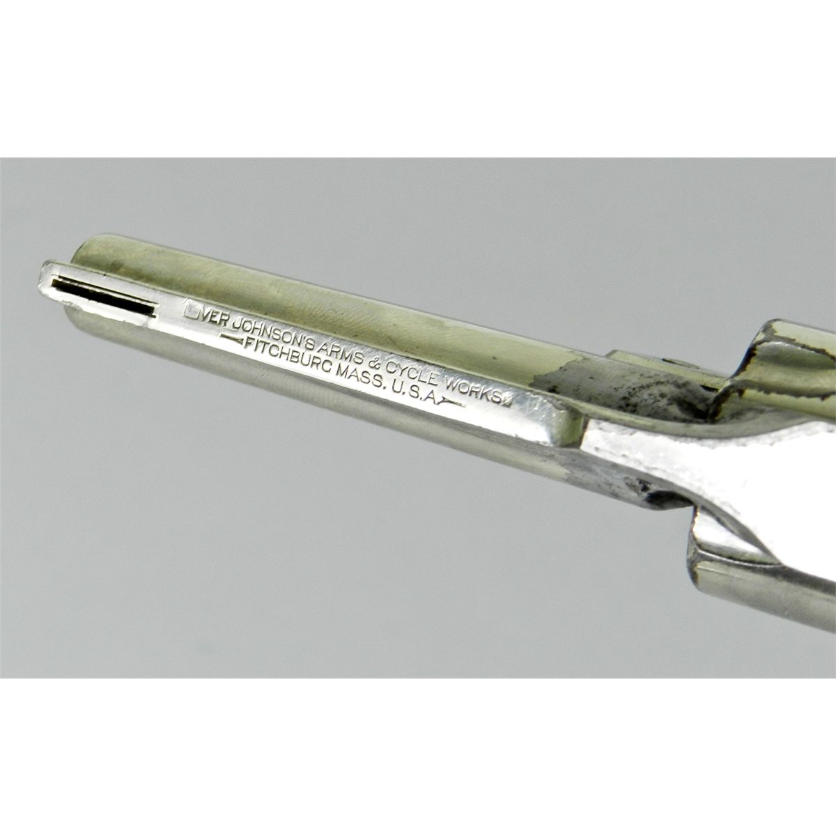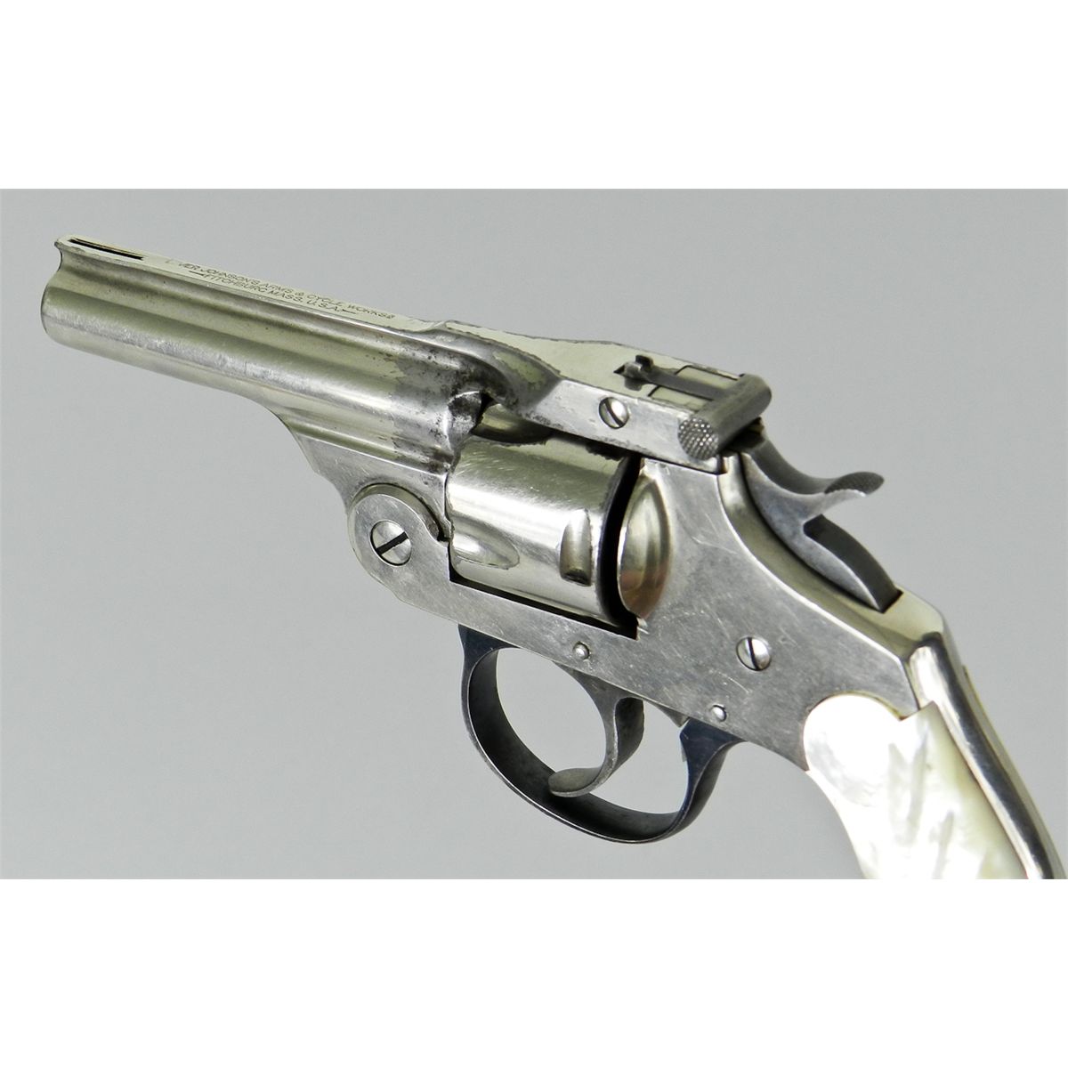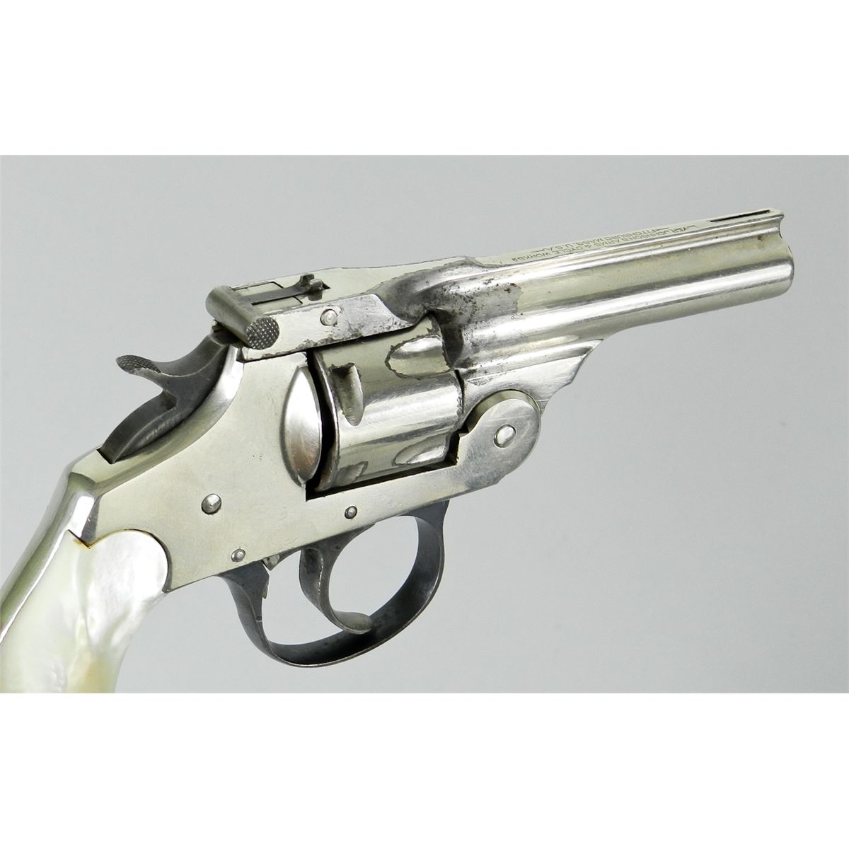 Iver Johnson Top-Break Revolver, NVSN, .32 S&W cal., 3'' barrel, nickel finish, blue triggerguard, case colored hammer and trigger, factory pearl grips. Condition is fine retaining 92% original nickel with losses near forcing cone. Grips remain very iridescent with no chips or losses. Action is crisp, bore is fine. Est.: $150-$300.